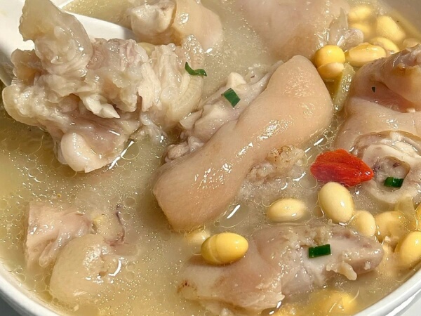 1、黄豆清洗干净,提前浸泡一个晚上。猪蹄清洗干净,冷水下锅焯水,加葱姜料酒去腥,煮开后撇掉浮沫,再捞起猪蹄沥干水分备用。