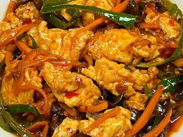 4、另起锅烧油,油热后放入葱蒜爆香,再放入豆瓣酱翻炒出红油,然后放入胡萝卜丝、木耳丝和青椒丝翻炒均匀,炒软后放入鸡蛋。