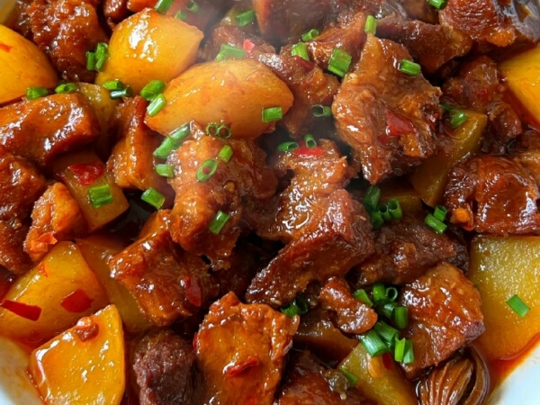 3、接着放入土豆块,继续焖煮十分钟,再放入食盐、胡椒粉、白糖、鸡精,翻炒均匀入味后即可出锅。