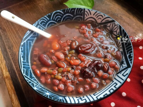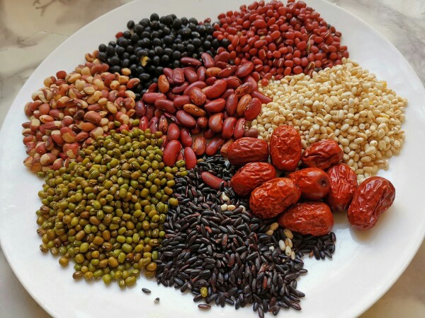 所用食材:麦仁,黑米,红豆,豇豆,黑豆,绿豆,腰豆,红枣。