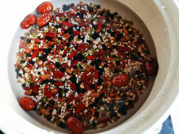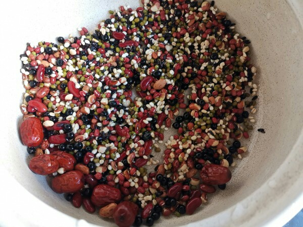 第四步:等到所有的食材都浸泡好以后,砂锅放到炉子上,先把豆类的食材放在锅里边来煮,等到煮上一二十分钟以后,再加入容易熟的谷物以及米类的食材。把所有的食材都差不多快要煮熟的时候加入红枣之类的果干,继续煮10分钟,粥充分熟透关火即成。