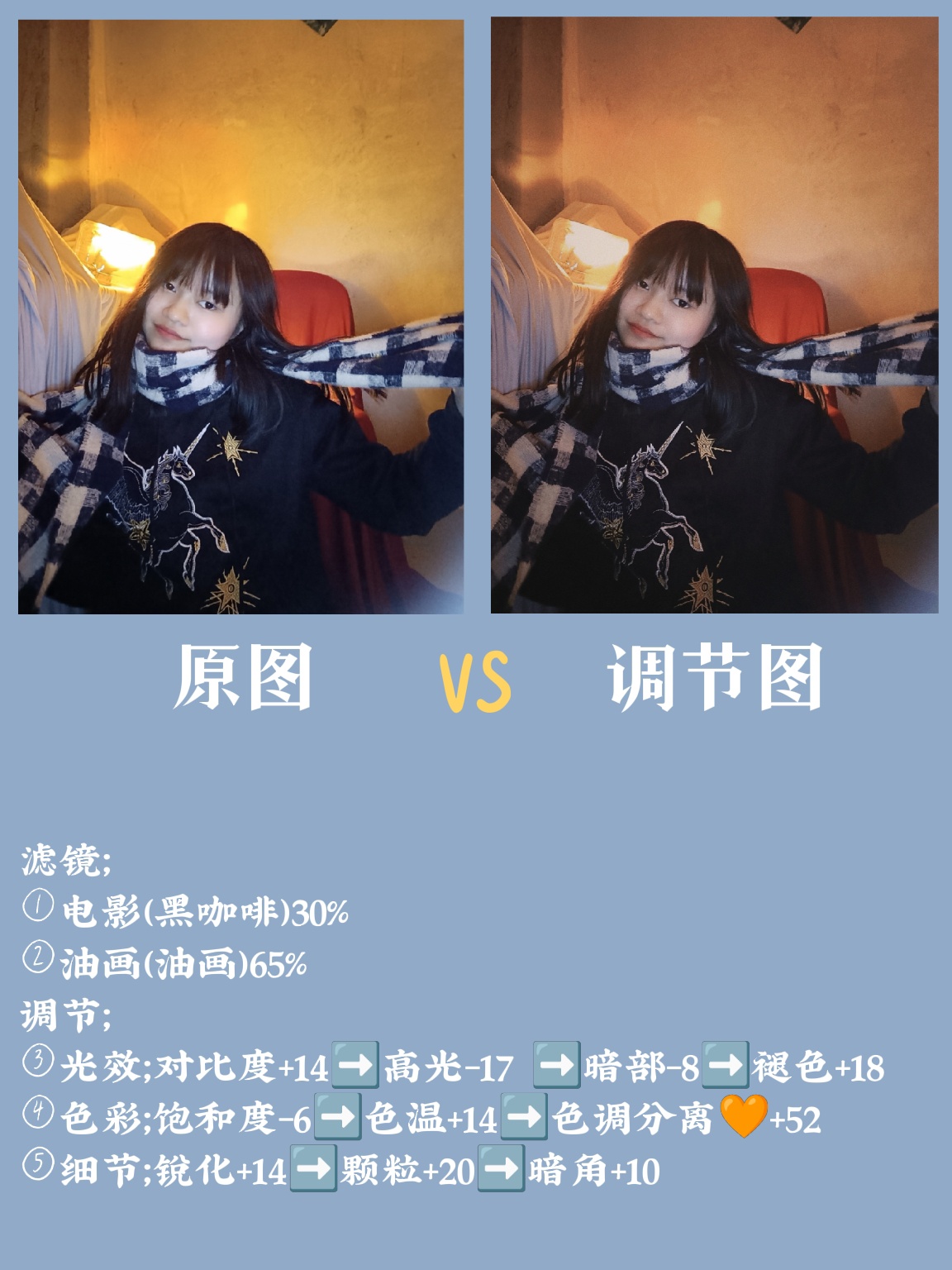 ⑤细节➡️锐化+14→颗粒+20→暗角+10