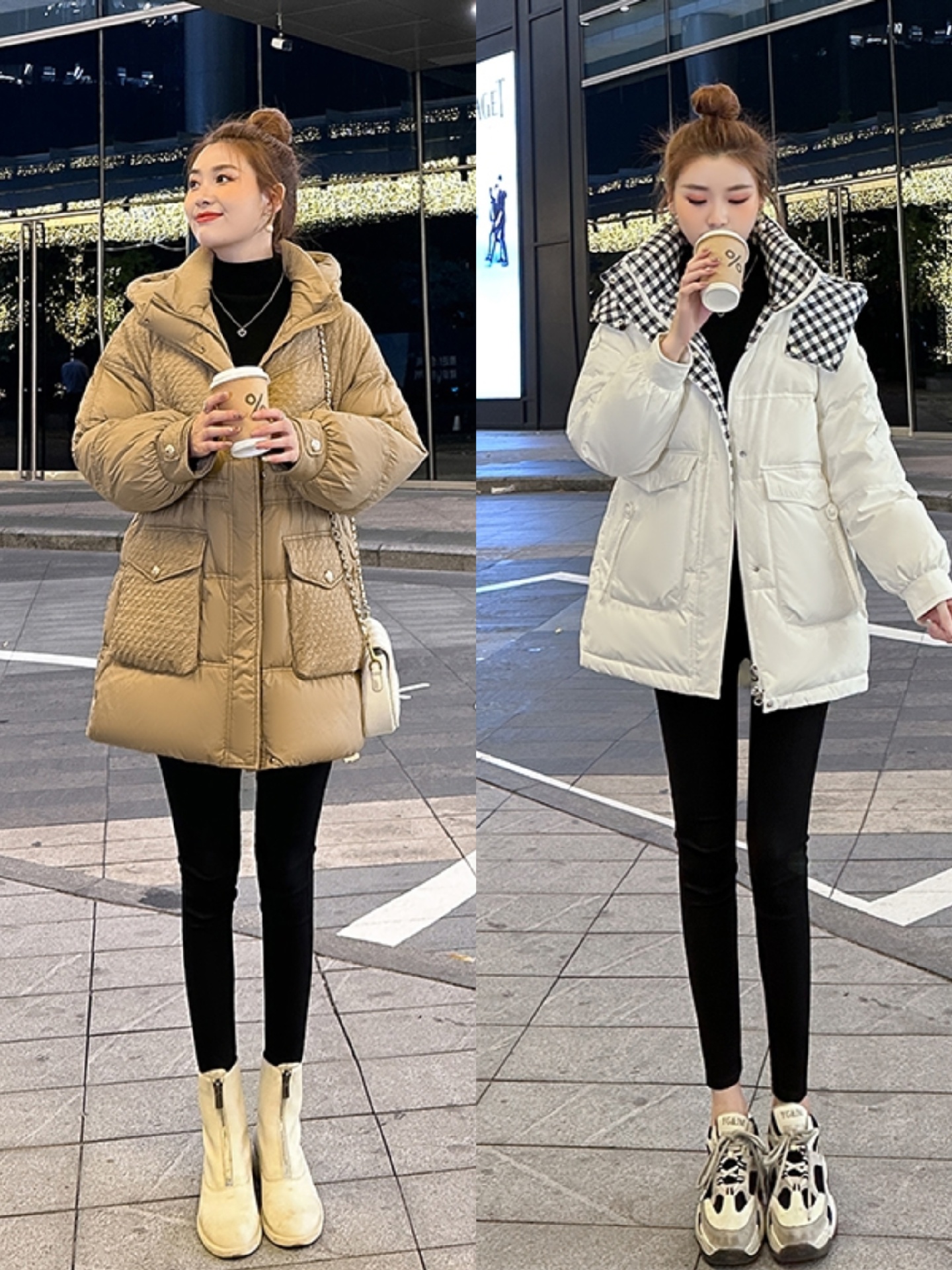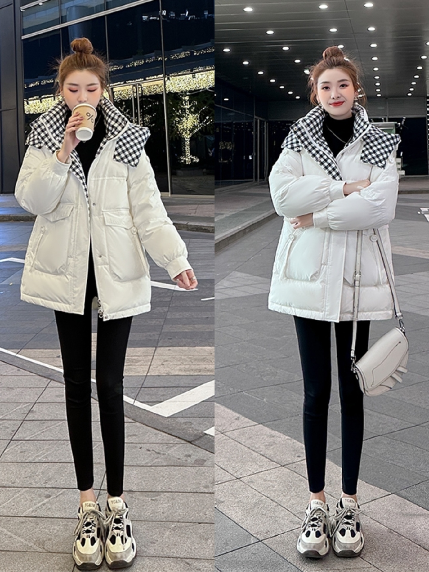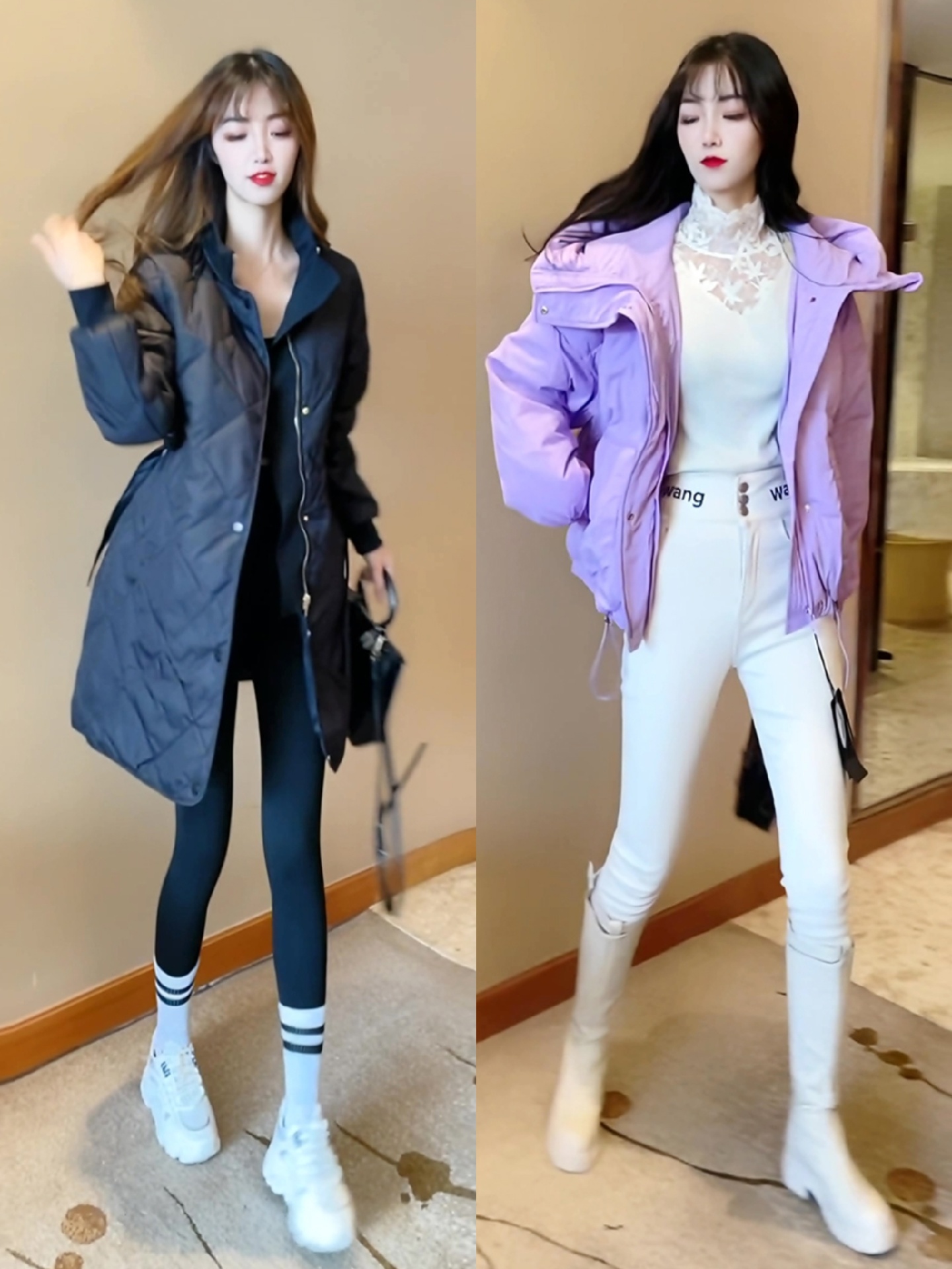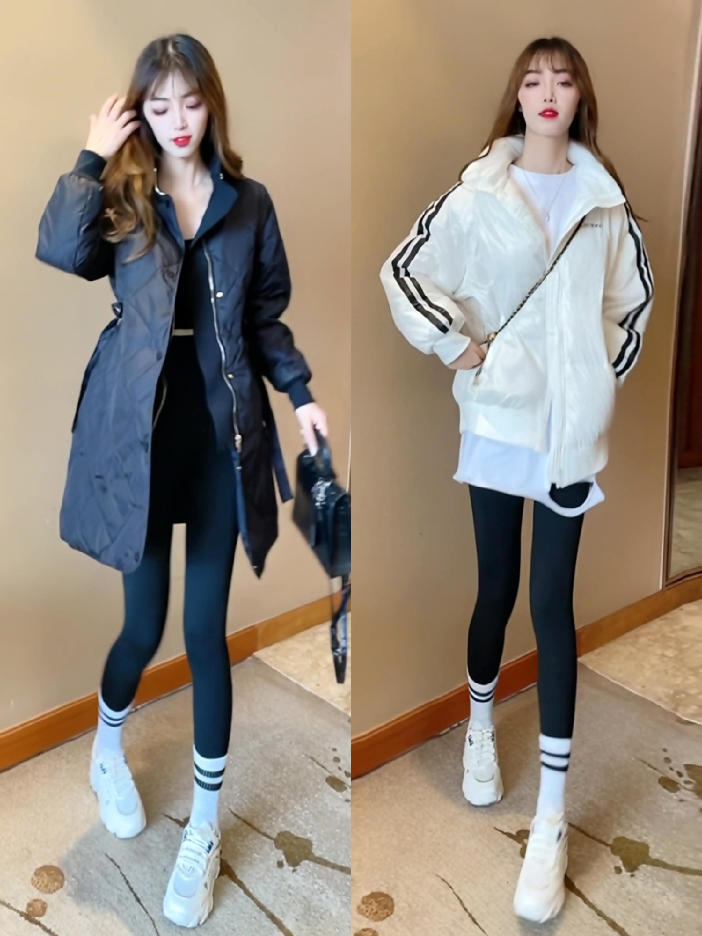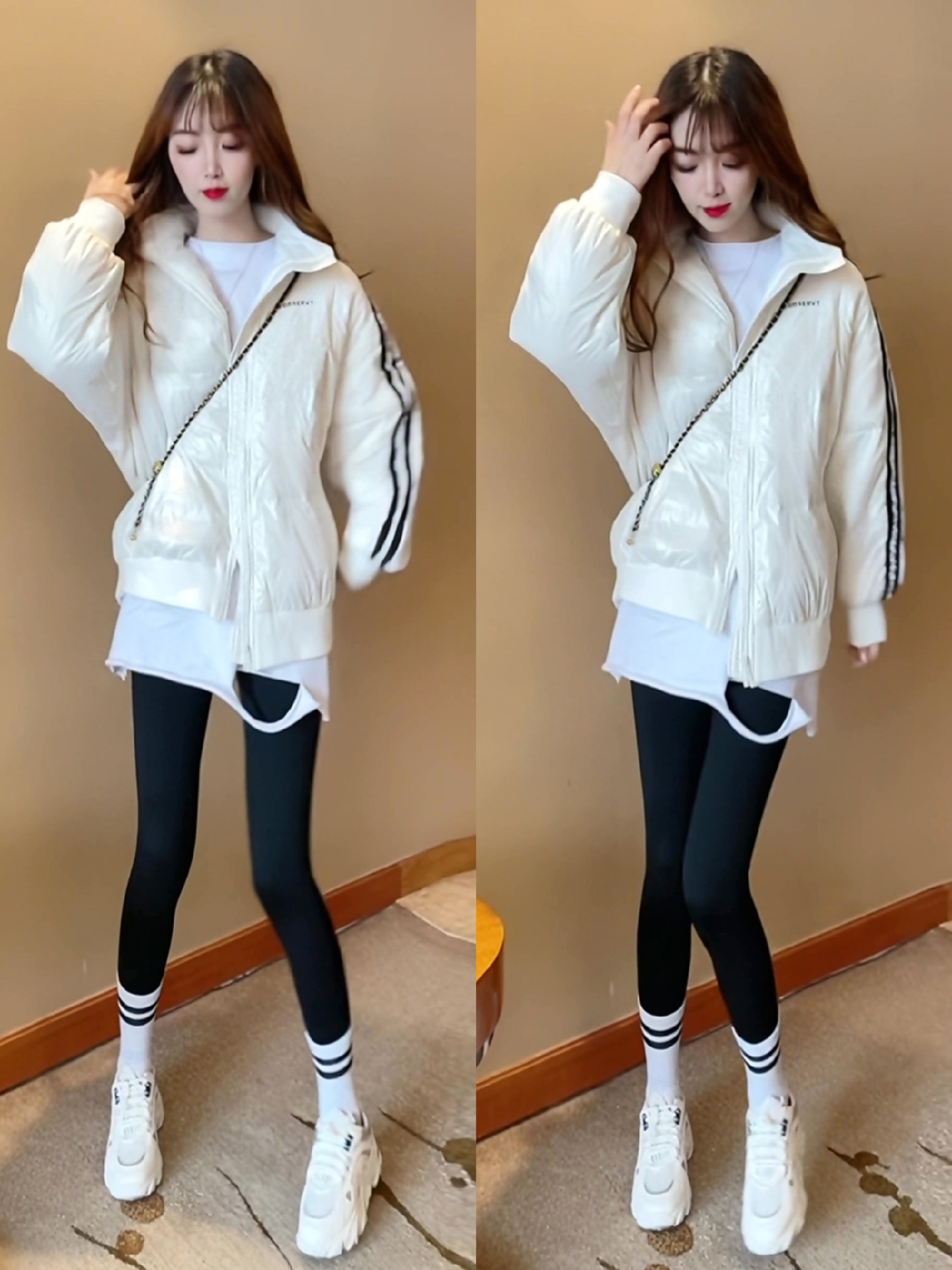 第一,白色短款羽绒服搭配黑色打底裤。显时尚显高。