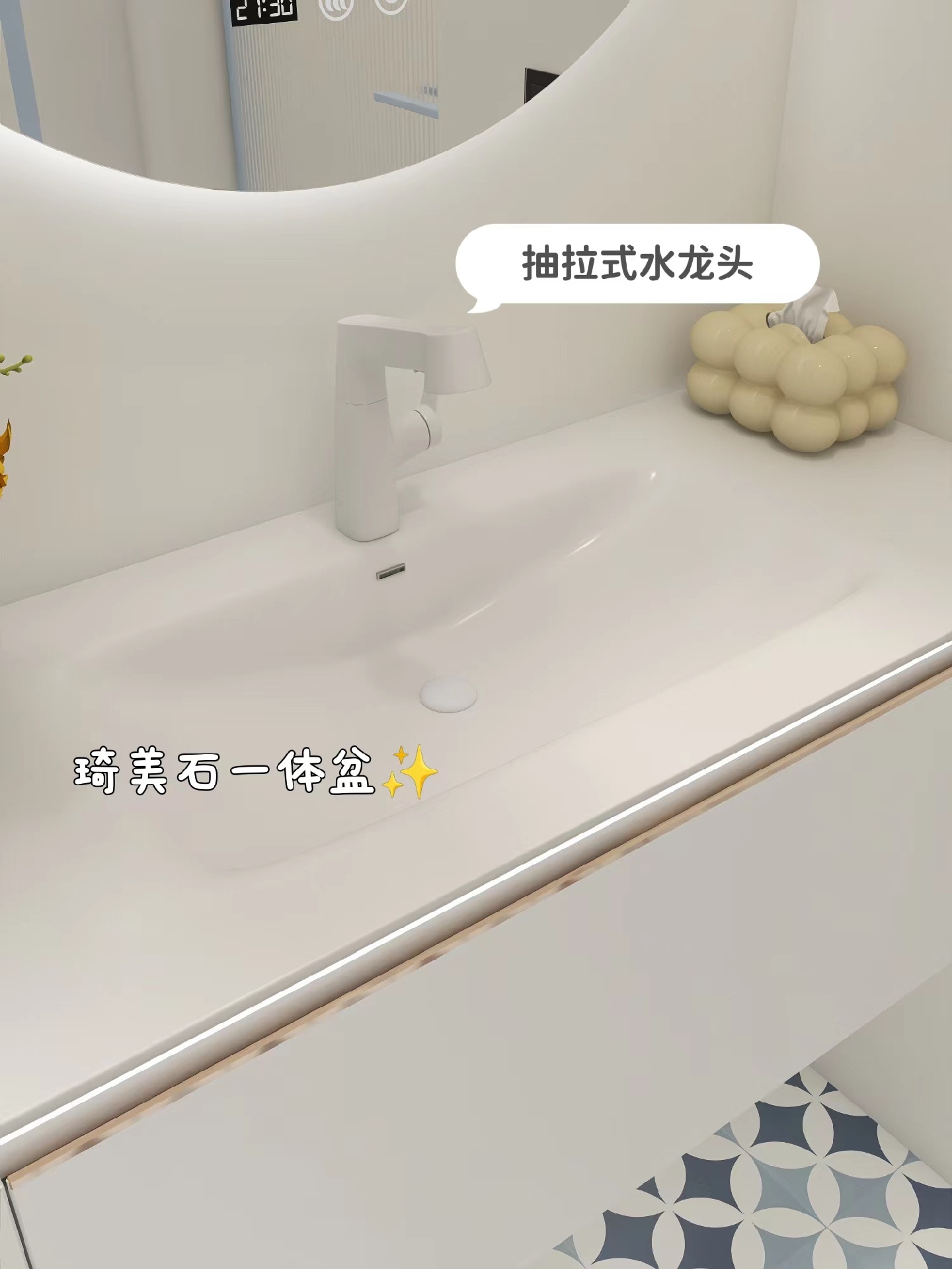 ✔台面是琦美石的,这种材质我认为是性价比较高的,坚固细腻质量又好👍一体盆的样式,边角都很圆润,没有卫生死角更好打理!