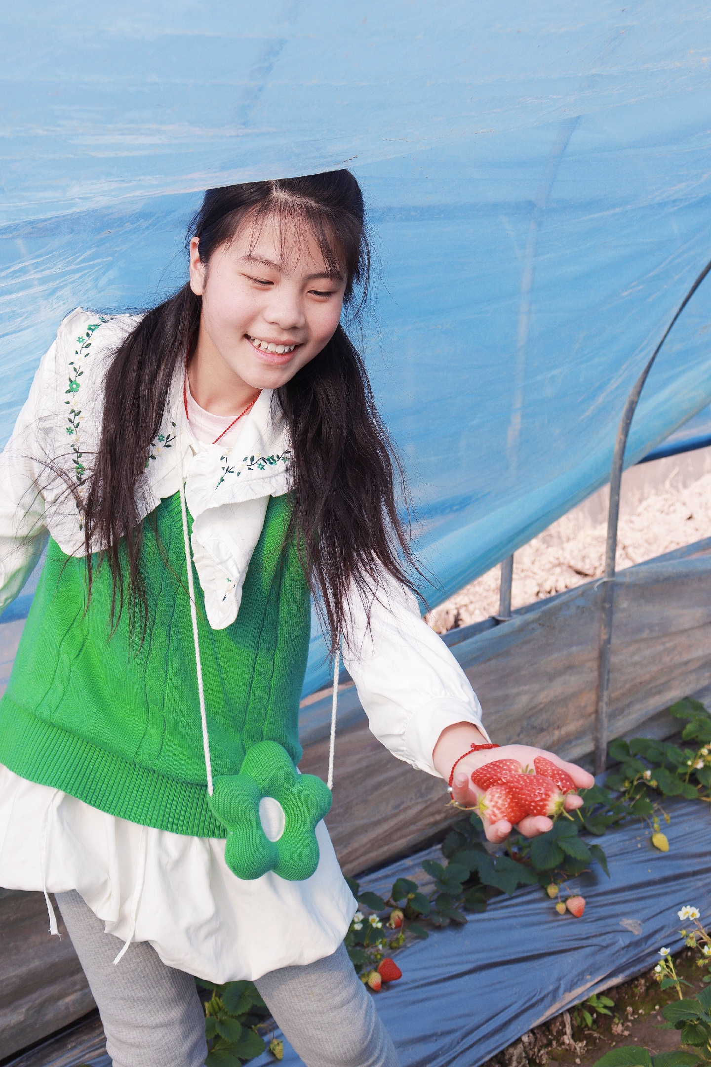 第二,把摘好的几个草莓,放在手上递给你的伙伴,突出分享的喜悦。