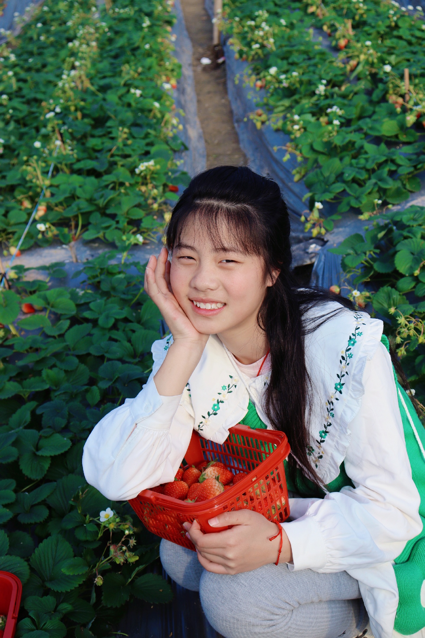 第九,小女孩蹲在草莓园里,先把篮子放在腿上,然后把手放在侧脸颊修饰。