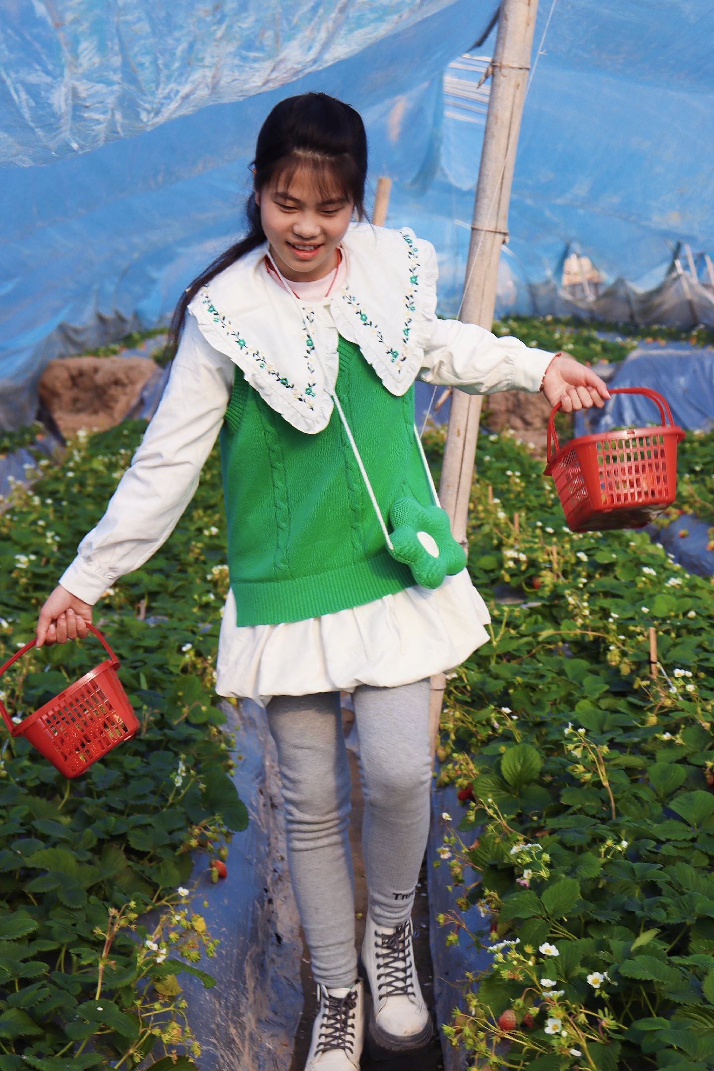 第四,让小女孩提着两个草莓篮子,快乐地蹦跳或是走路在草莓基地里。