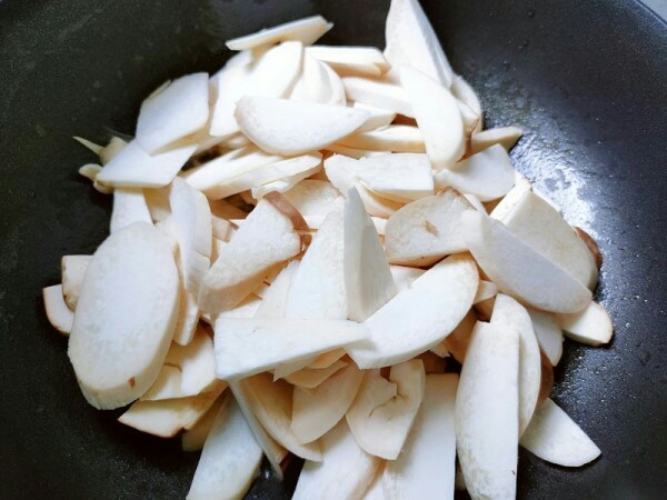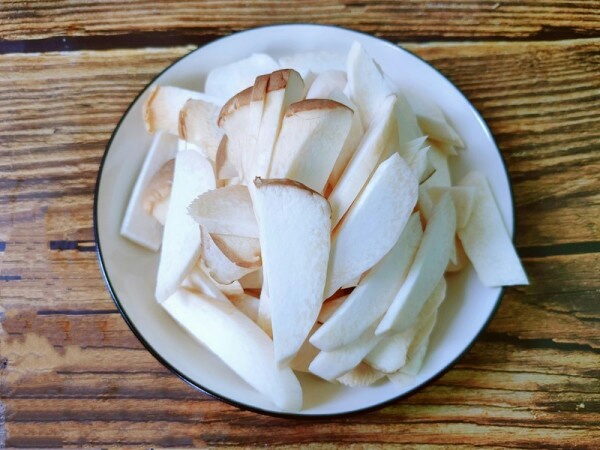 1、杏鲍菇洗净,切成片,不要切太薄,不然就没口感了。