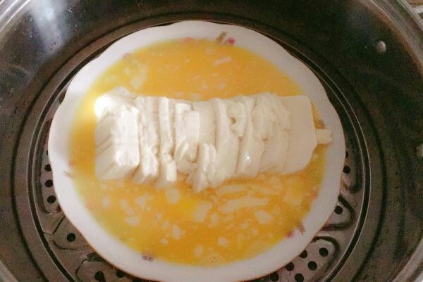 2、锅里加水烧开,内酯豆腐切成块,放入碗中,倒入鸡蛋液,包上保鲜膜后扎几个洞,放入锅中蒸10分钟。香菇洗干净,切成碎末。