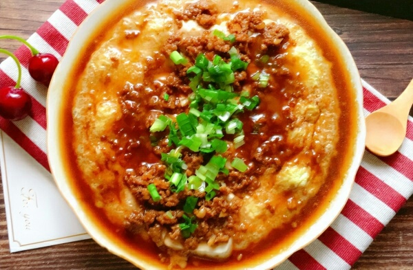 3、锅里倒入适量油,放入腌好的鸡胸肉末翻炒至变色,倒入香菇炒至断生,加入适量食盐、生抽、蚝油、黑胡椒粉,倒入适量清水煮至浓稠,浇在蒸好的豆腐鸡蛋上,撒上葱花、熟白芝麻即可。