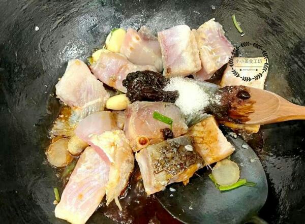 2、锅烧热后倒入凉油,爆香葱姜蒜后放入鱼块翻炒片刻,接着加入适量料酒,生抽,老抽,黄豆酱,海鲜酱和白糖,充分翻炒均匀。
