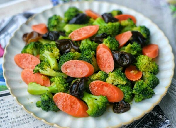 锅内加油,烧热后放入蒜末爆香,再倒入火腿肠、西蓝花、木耳翻炒。