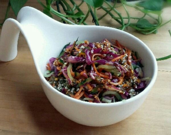 紫甘蓝切成细丝,胡萝卜、黄瓜切成细丝,紫甘蓝丝冲洗一下,沥干水分。