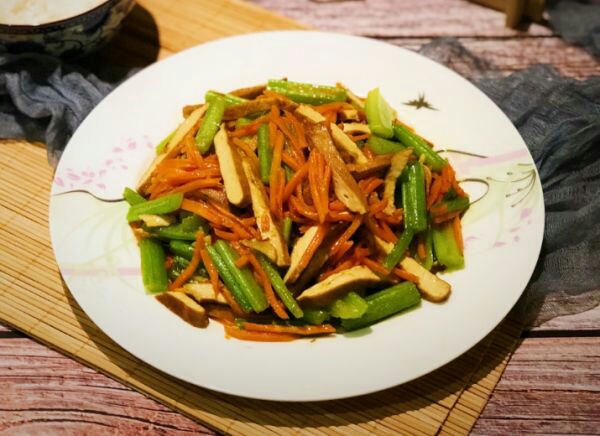 胡萝卜去皮洗净,切成细丝;香干冲洗一下,切成小条;姜丝、蒜末切好待用。