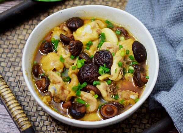 干香菇加水浸泡,泡发后清洗干净待用。鸡腿或者半个鸡,剁成小块,加水清洗干净,沥干水分。