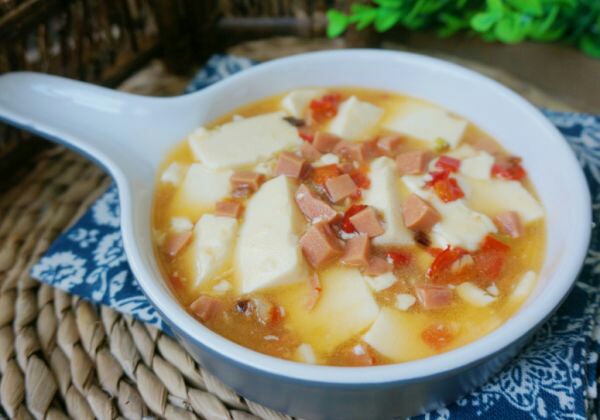 然后倒入火腿肠丁翻炒半分钟,炒好后倒入适量热水,大火煮开。再倒入豆腐块炖煮。