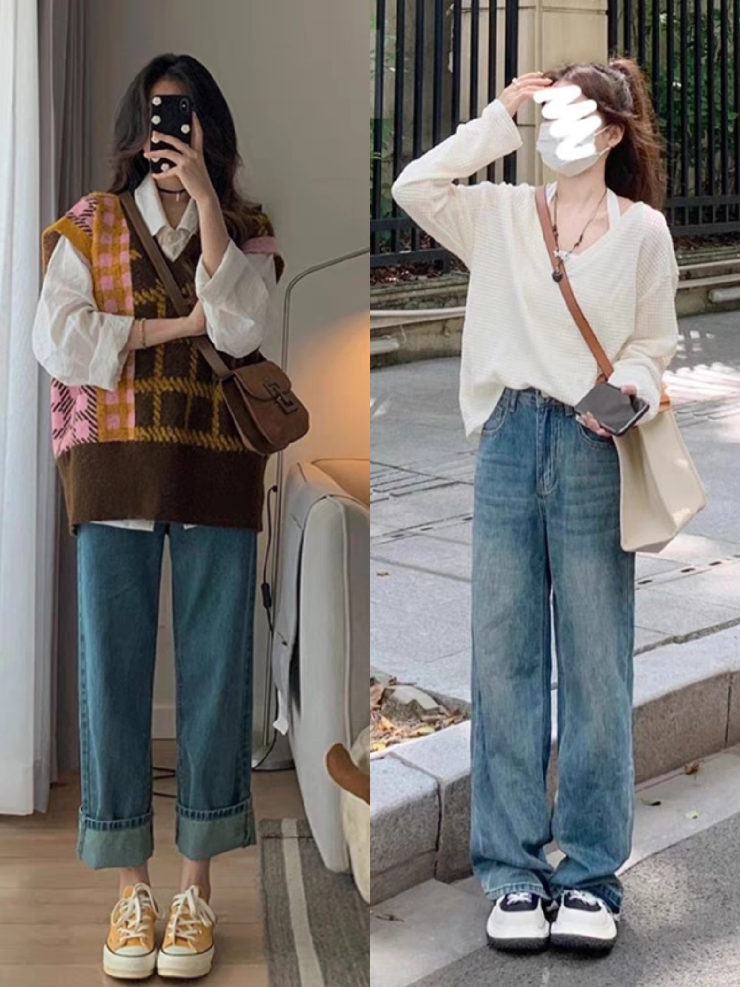 第二、女生用九分牛仔裤搭配黑色马甲内搭衬衫,气质又显瘦。