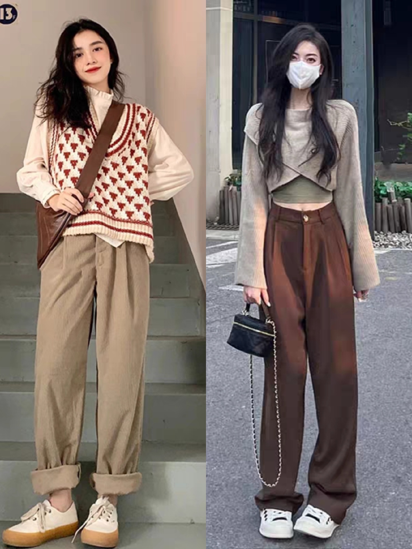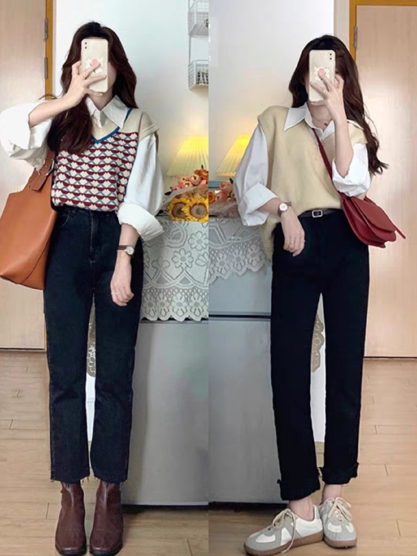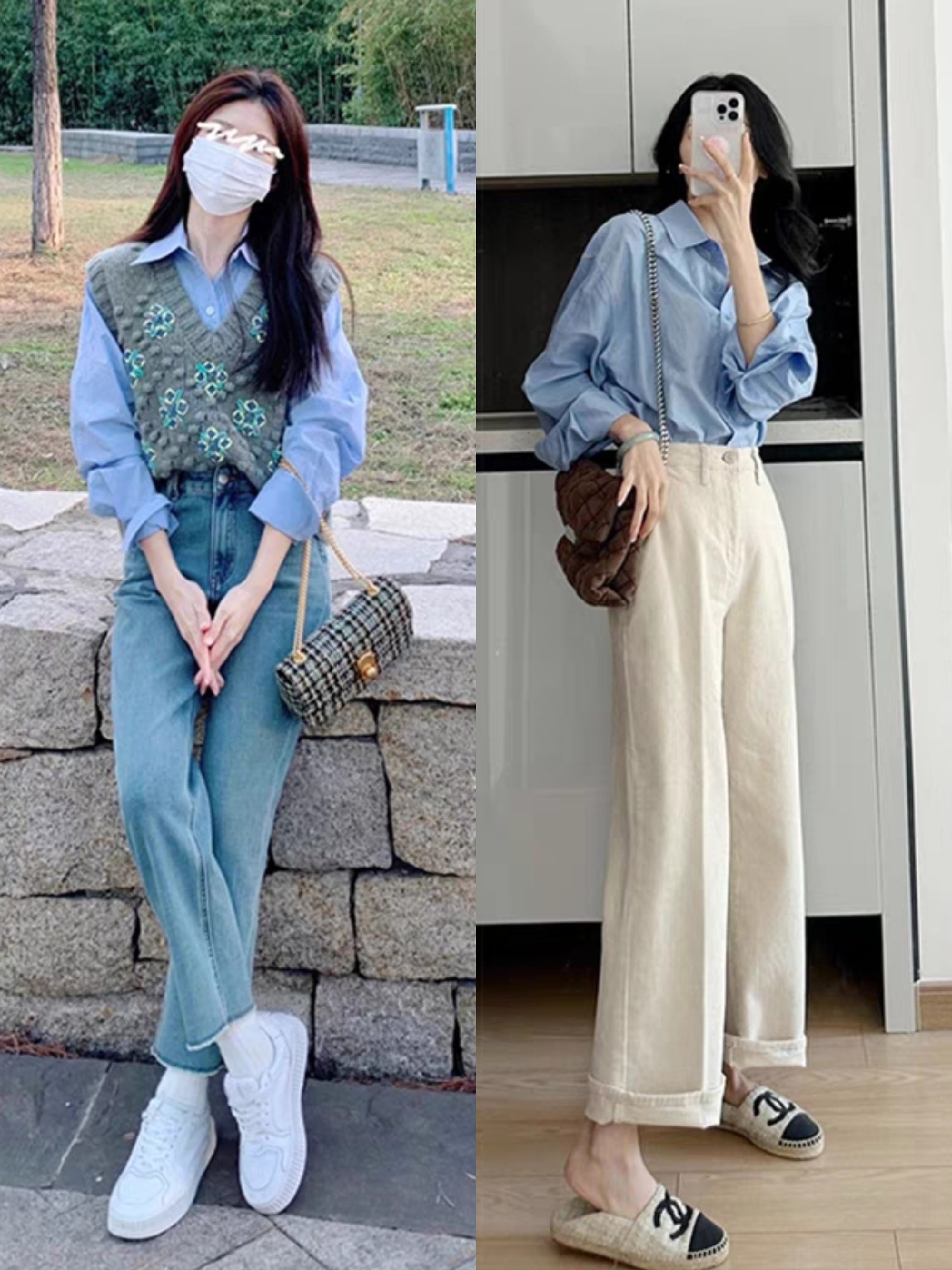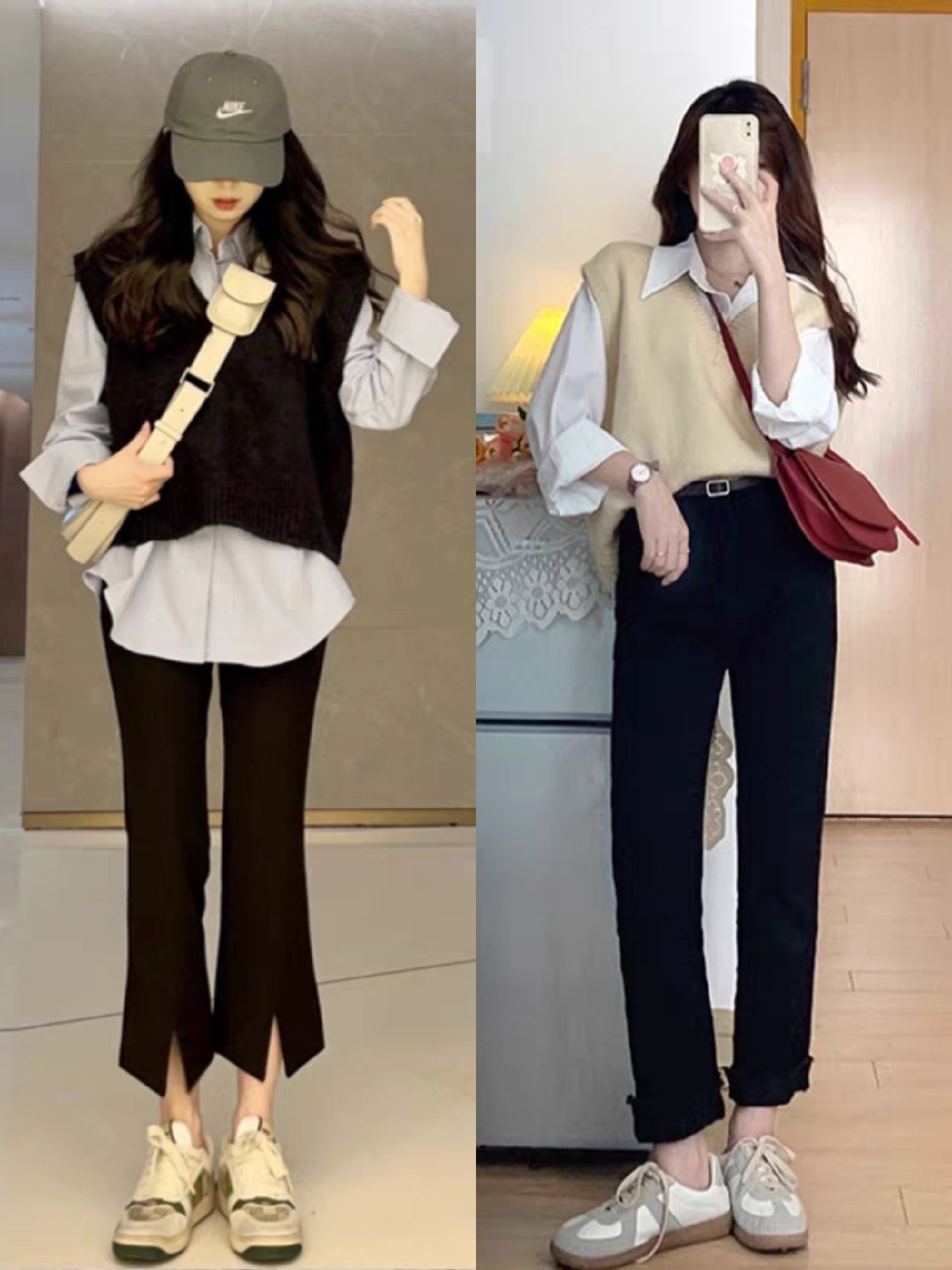 在女生选择宽松针织马甲和衬衫的搭配时,我建议稍微长款的衬衫用塞下摆的方法。用衬衫的下摆塞进裤腰里,干净利落。也可以选择短款的针织马甲,稍微露出衬衫的下摆,会让你的穿搭更显层次感。