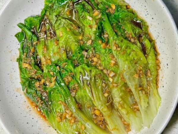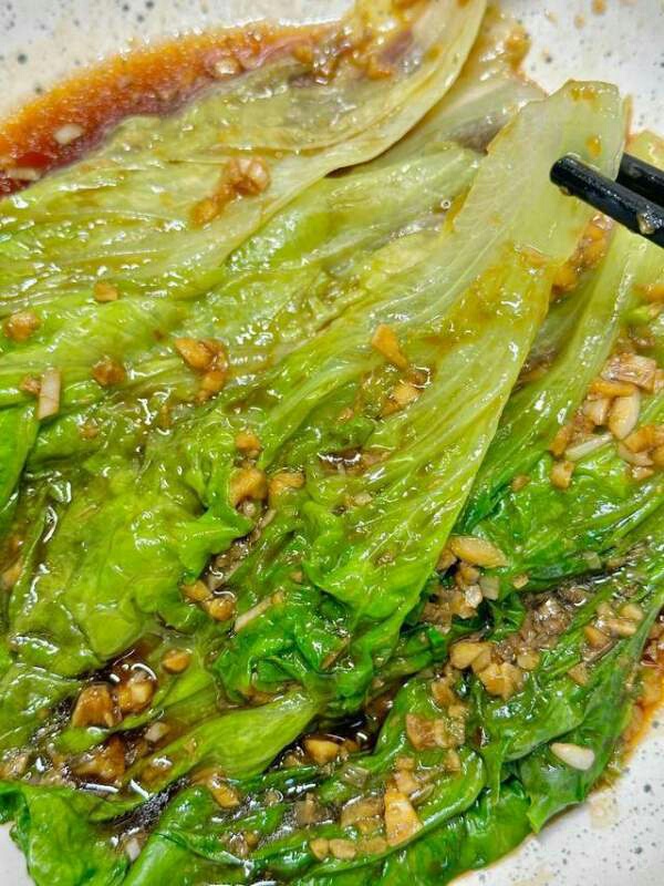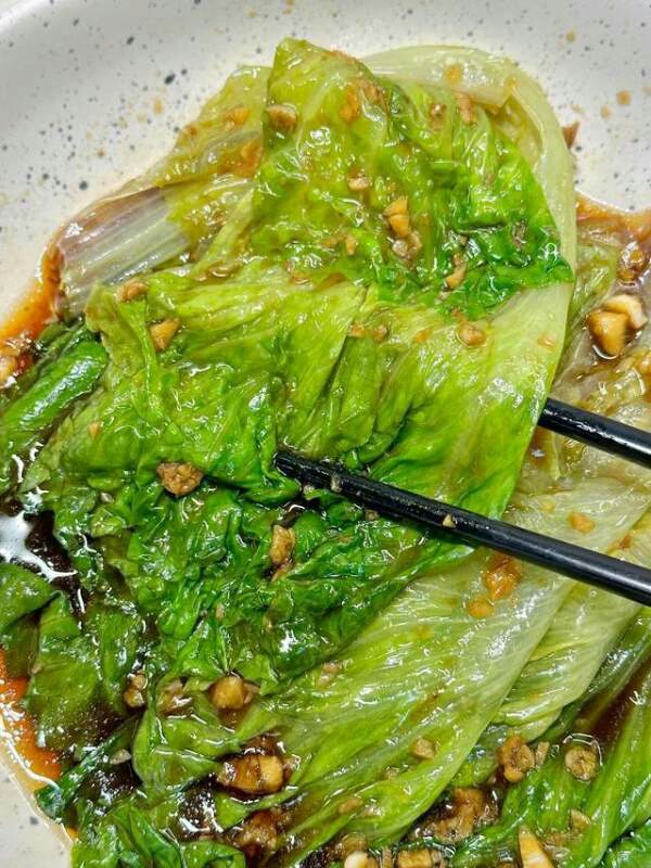 3、把调制好的酱汁均匀地淋在生菜上面,拌一拌就可以开吃了,毫不夸张地说,这个酱汁可以拌一切绿色的蔬菜,也是下饭又解馋,但是别人说给肉都不换那就过分了哈。