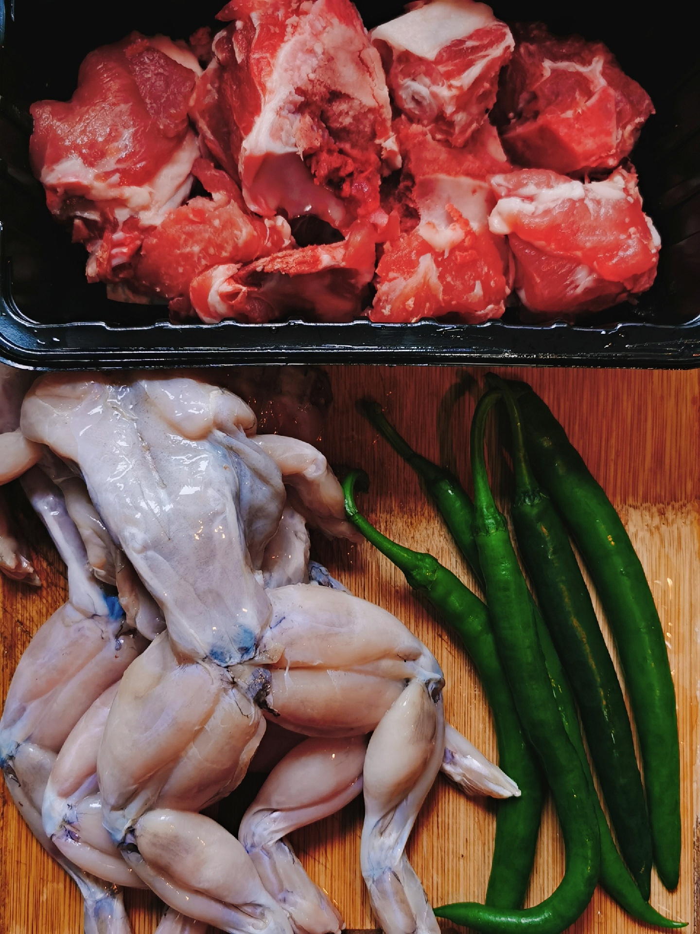 今晚炒个咖喱牛蛙,再做个黄焖肉排一起下饭。