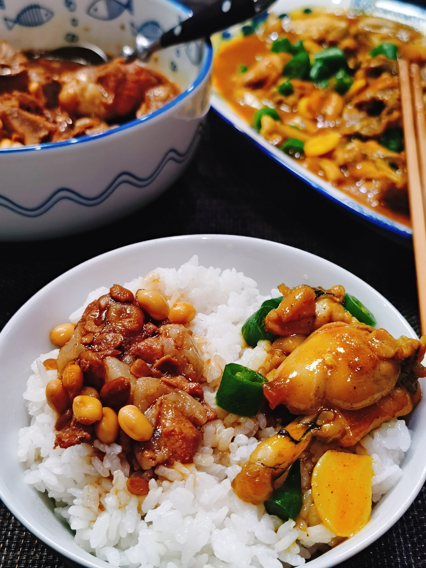 牛蛙切块抓盐,加料酒泡十分钟冲洗干净,再撒上大量白胡椒粉,淋一点味极鲜抓匀腌二十分钟后挤干。锅里热油下蒜瓣姜片爆香,放牛蛙块快速翻炒变色,这时可以放黄咖喱酱也可以用中式油咖喱,这回我选的是中式油咖喱和东南亚辣酱的组合,再撒入辣椒段一起大火翻炒,炒到酱汁裹上牛蛙了,最后一点水淀粉勾芡就好啦。