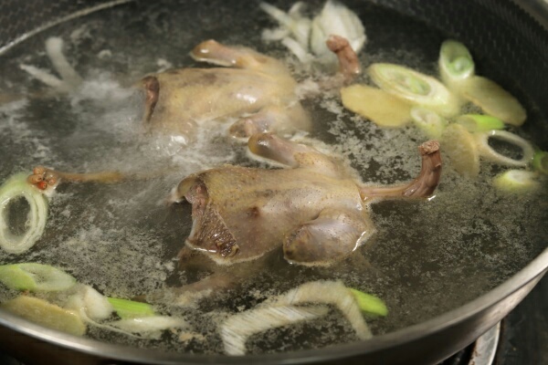 3.鸽子凉水下锅,放入一勺食用盐,加入葱姜,少量的料酒,用开水将鸽子给它焯水两分钟,然后将焯烫后的鸽子捞出来,迅速放入冷水中过凉,这样可以使鸽子的肉质变得更加紧致,吃起来更有嚼劲。