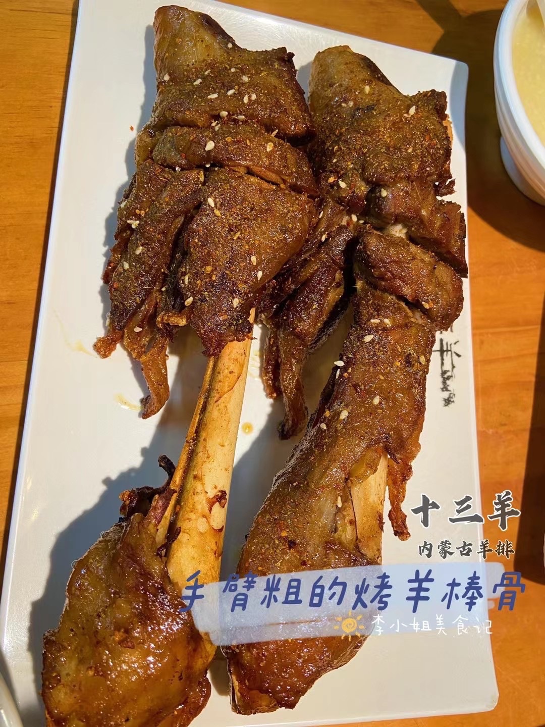 烤羊棒骨 最喜欢的一道菜,大号羊棒骨真的好大,和女生的小手臂一样大。拿起来啃超级爽,类似毽子肉的肉筋和带一点炙烤盐味的柔韧羊皮,肉筋也不硬,真不错。