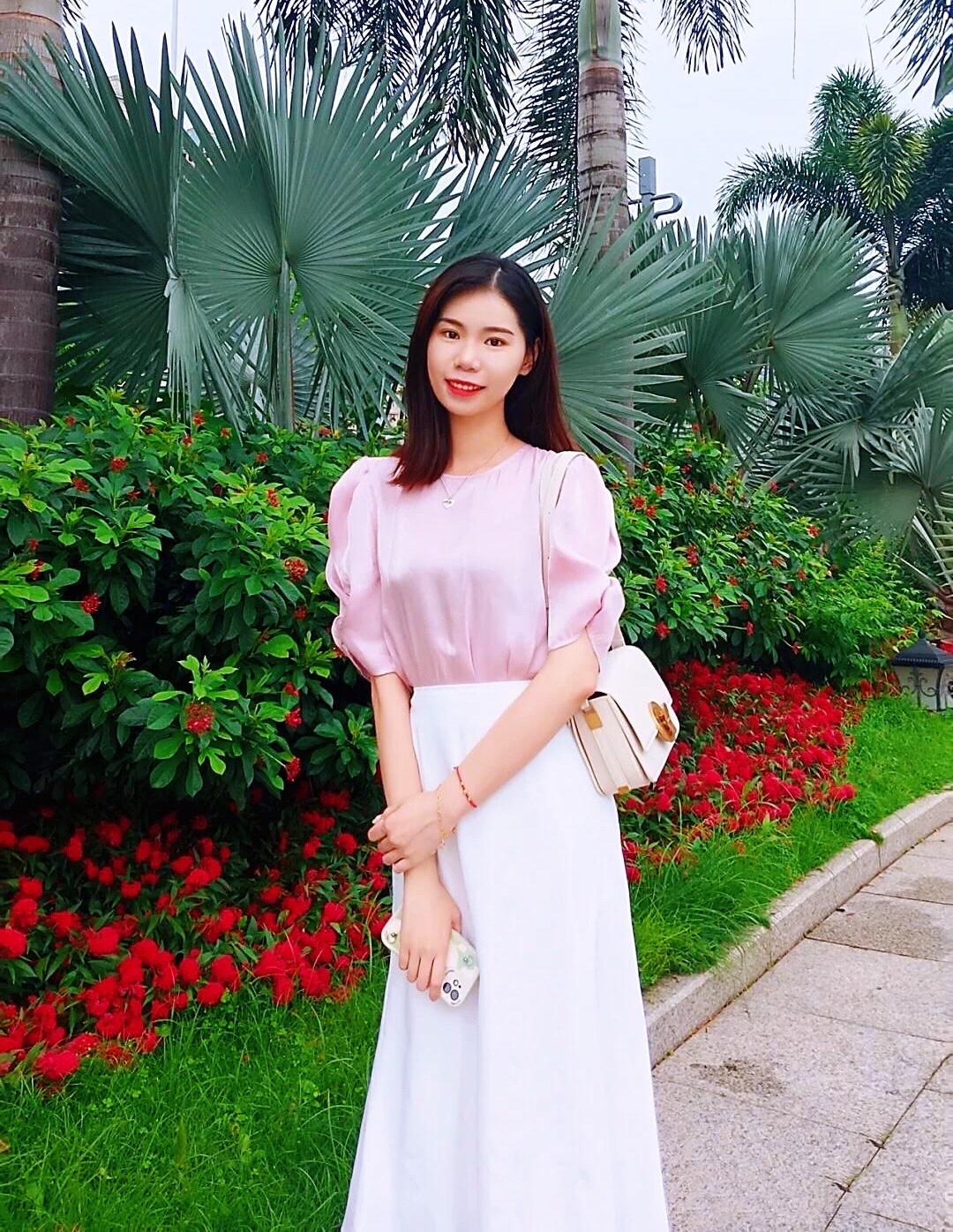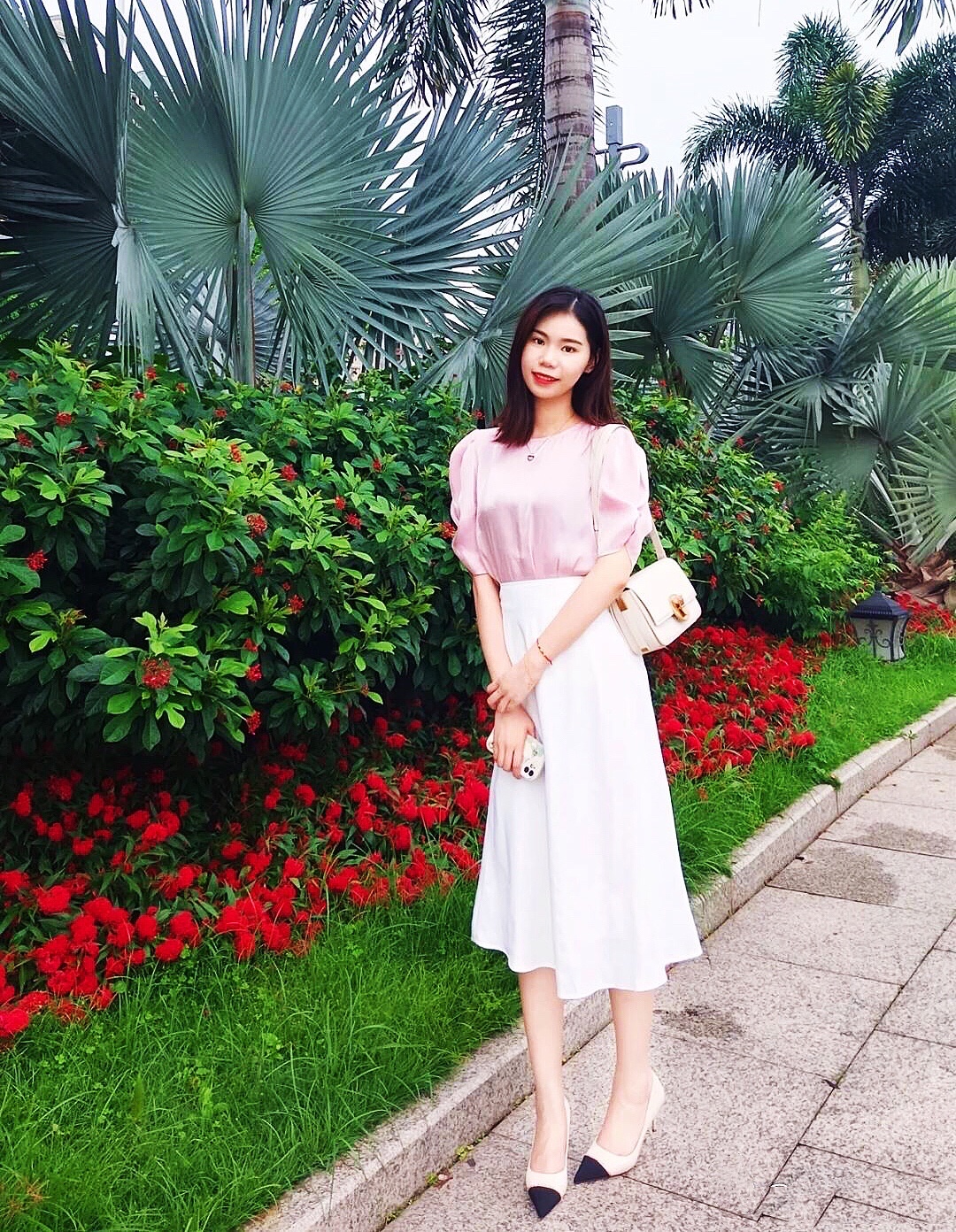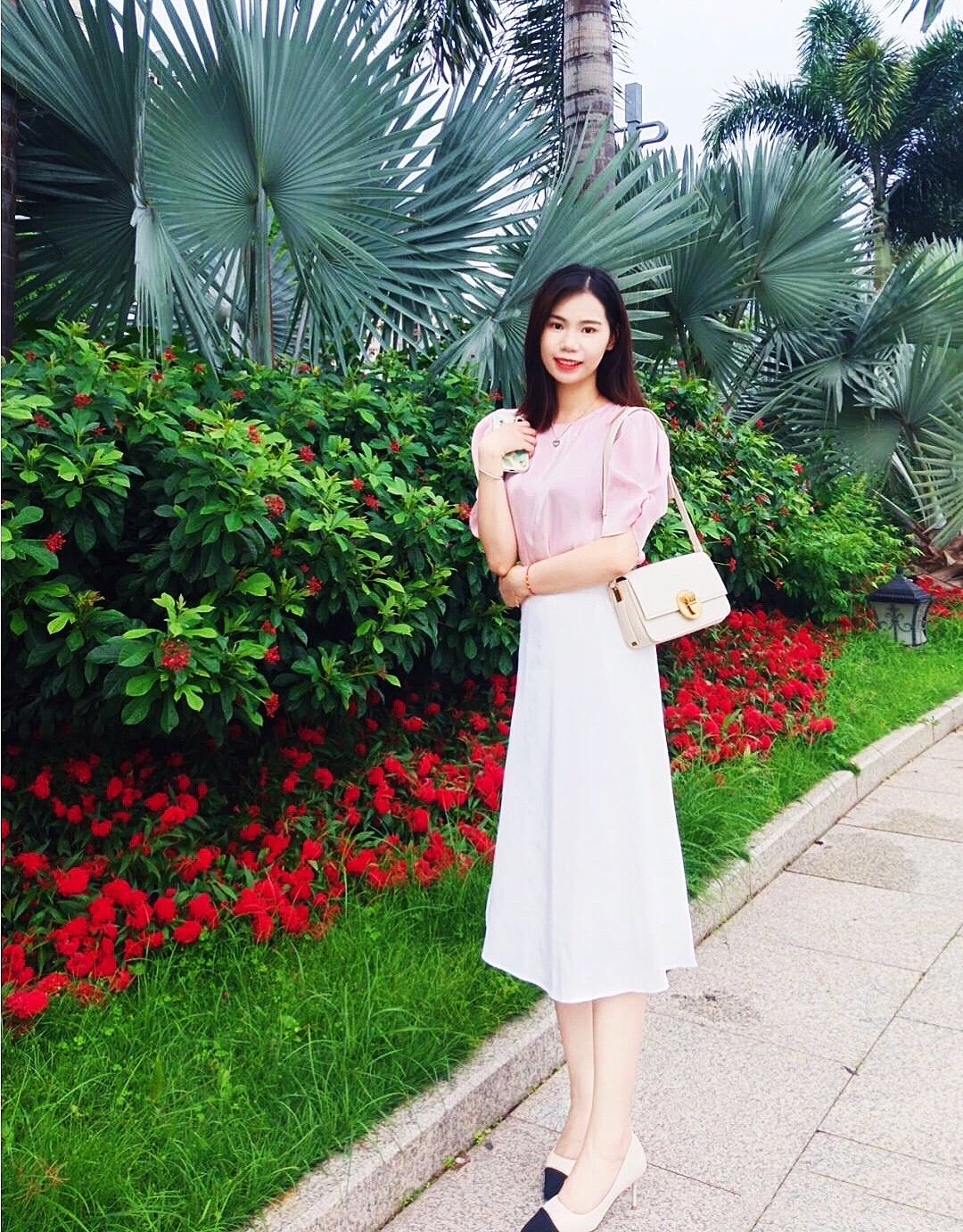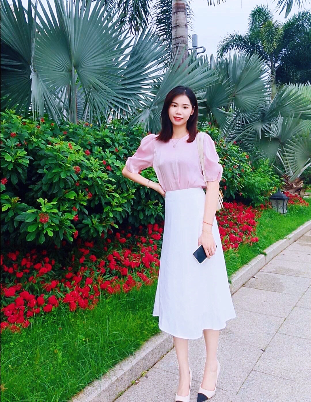 白色的长裙,搭配淡粉色的上衣,有点文艺范儿。🌸