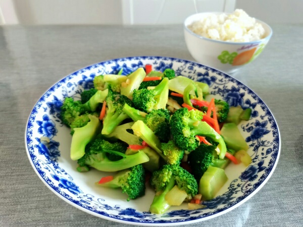 锅里热油,放葱花蒜末炒香,再放入西兰花,红萝卜丝,撒半勺盐、几滴味极鲜,翻炒一分钟左右出锅。