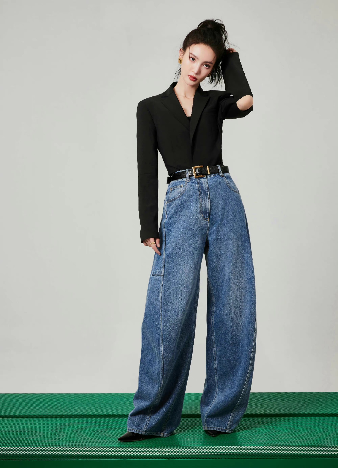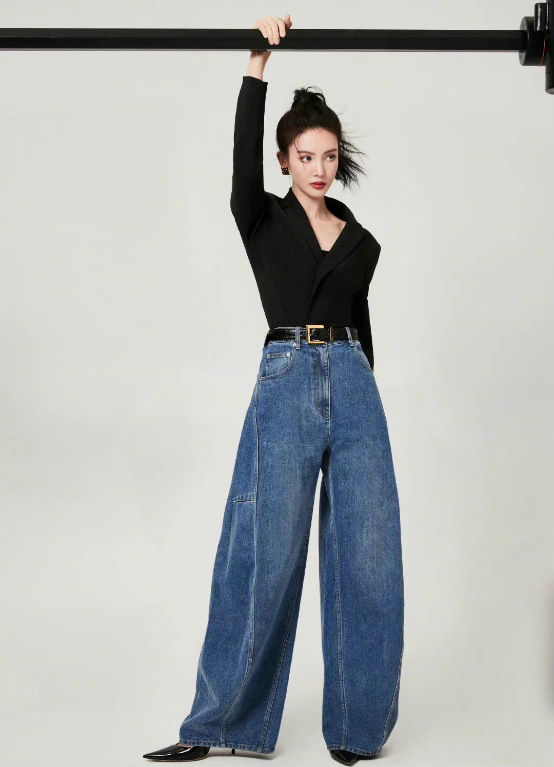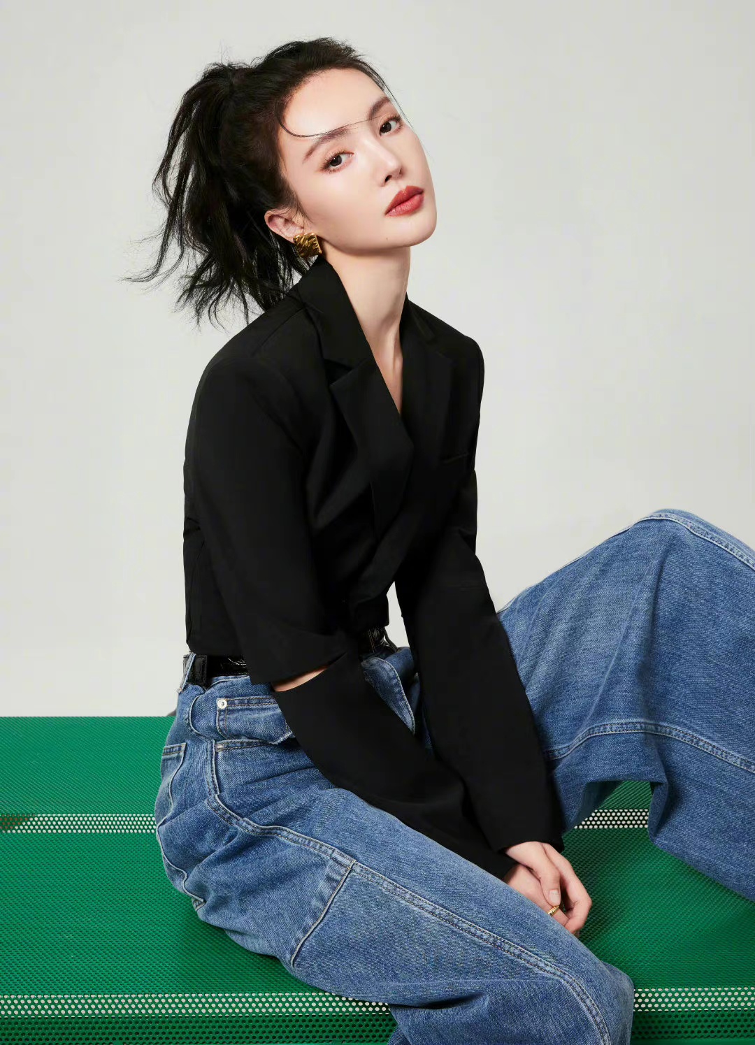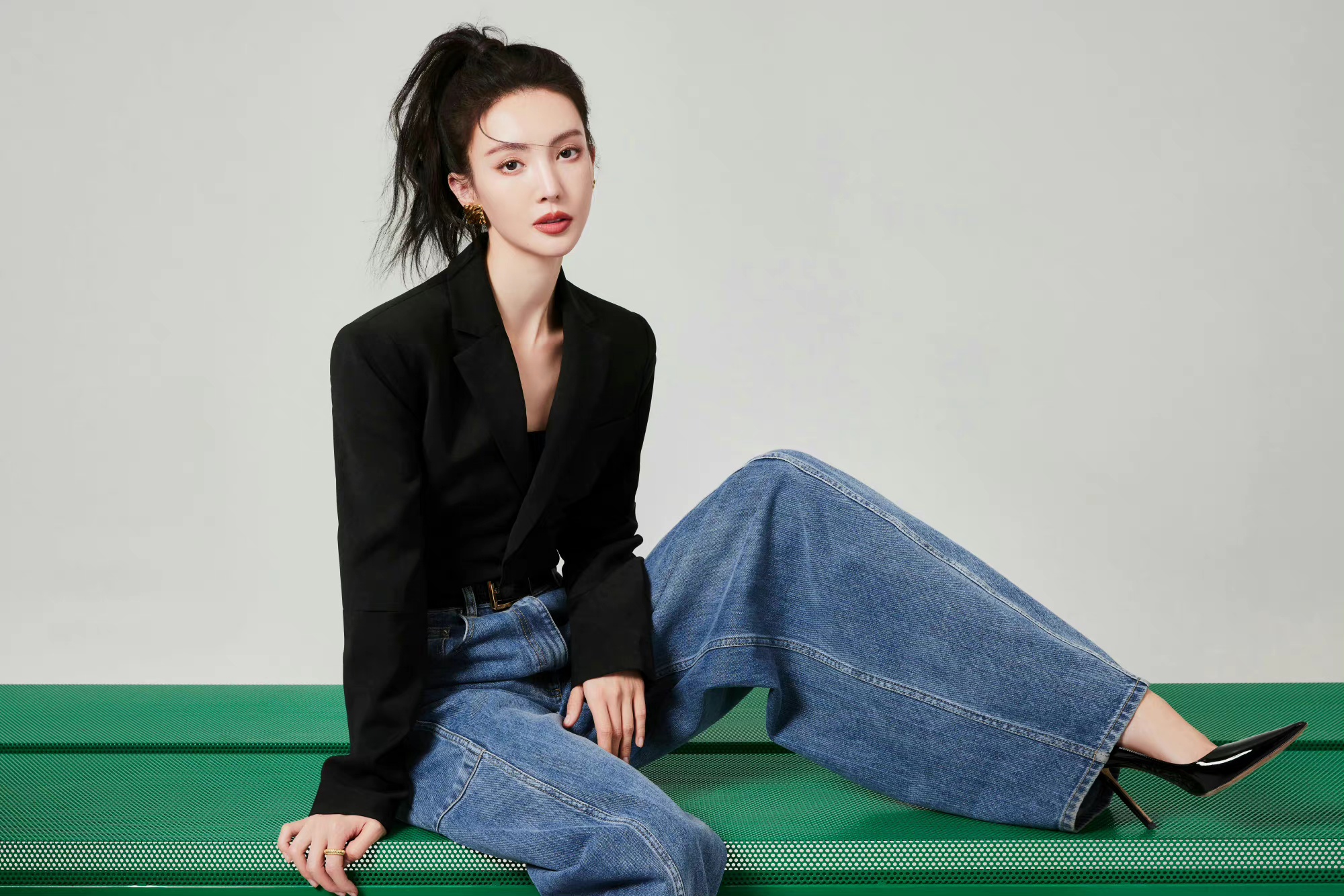活动造型图集,扎起利落高马尾,黑色高腰西装搭配阔腿牛仔裤,简约时髦的穿搭,摩登女郎的自信风尚。