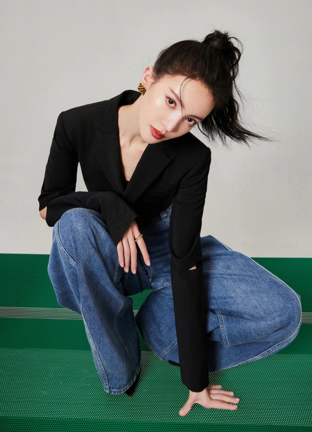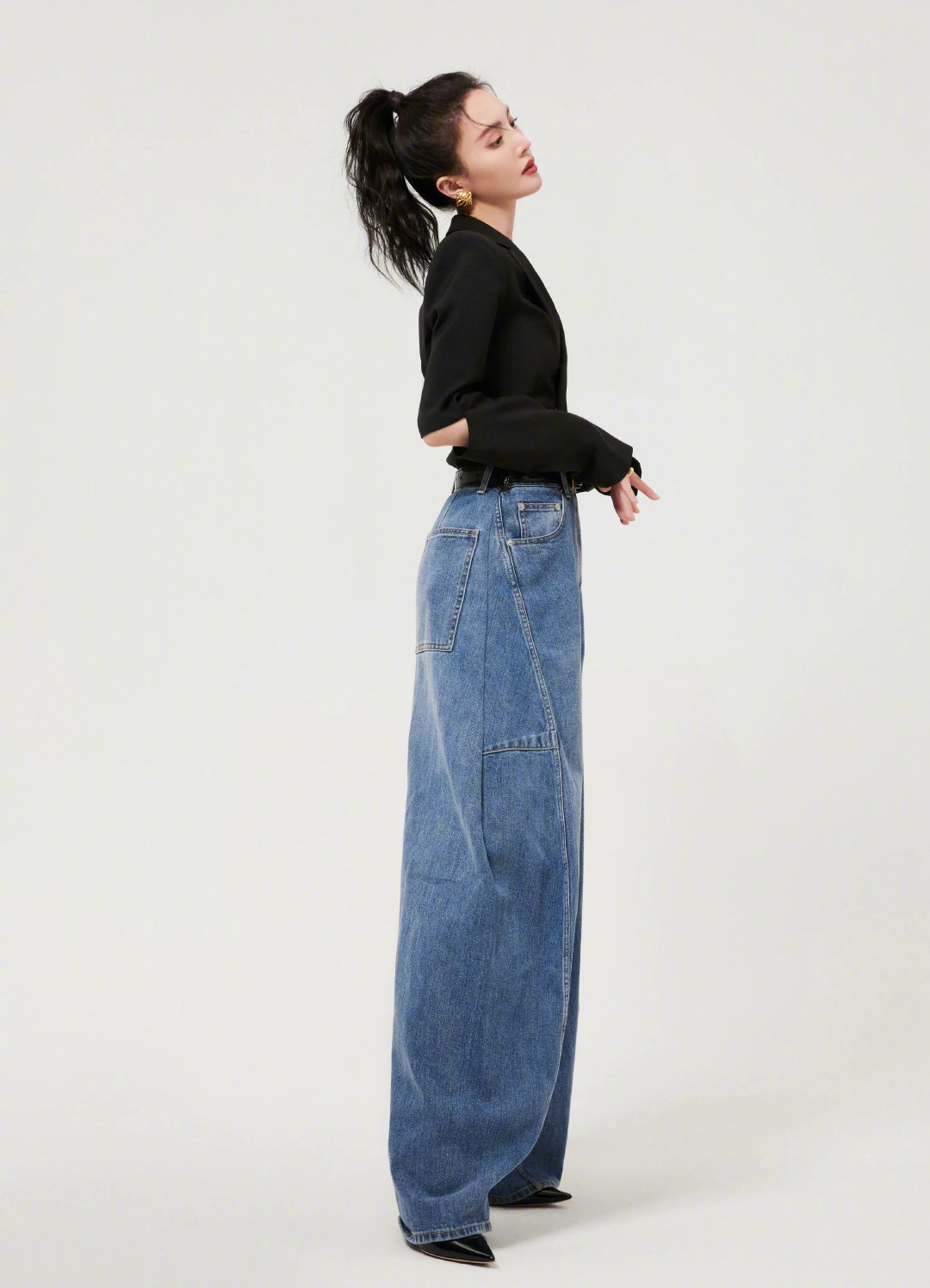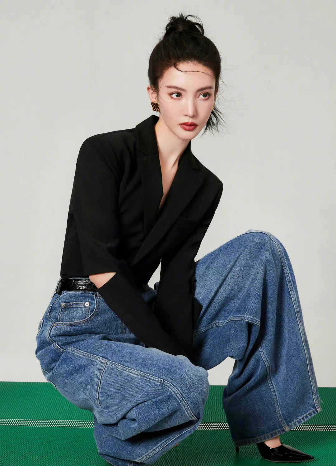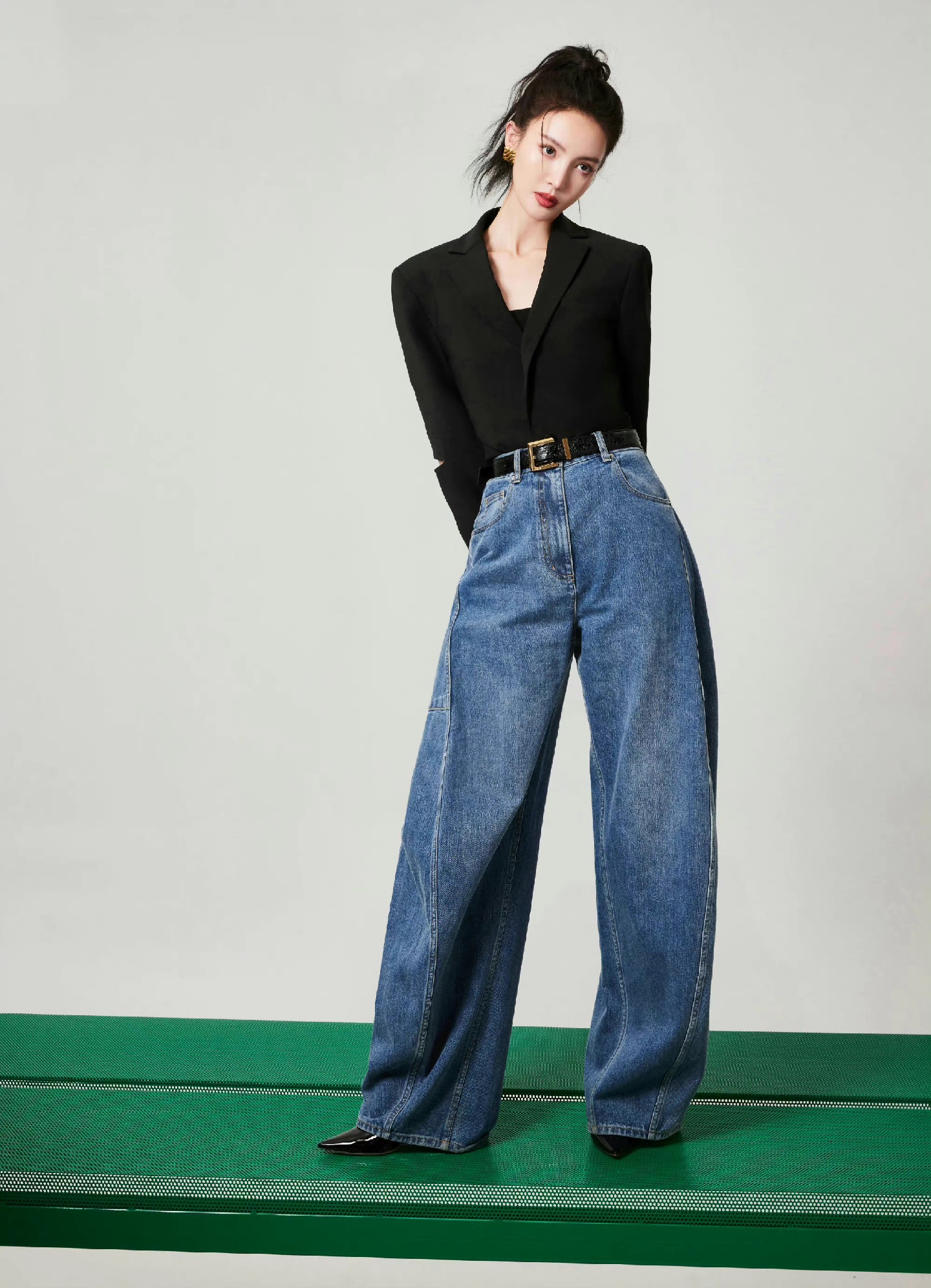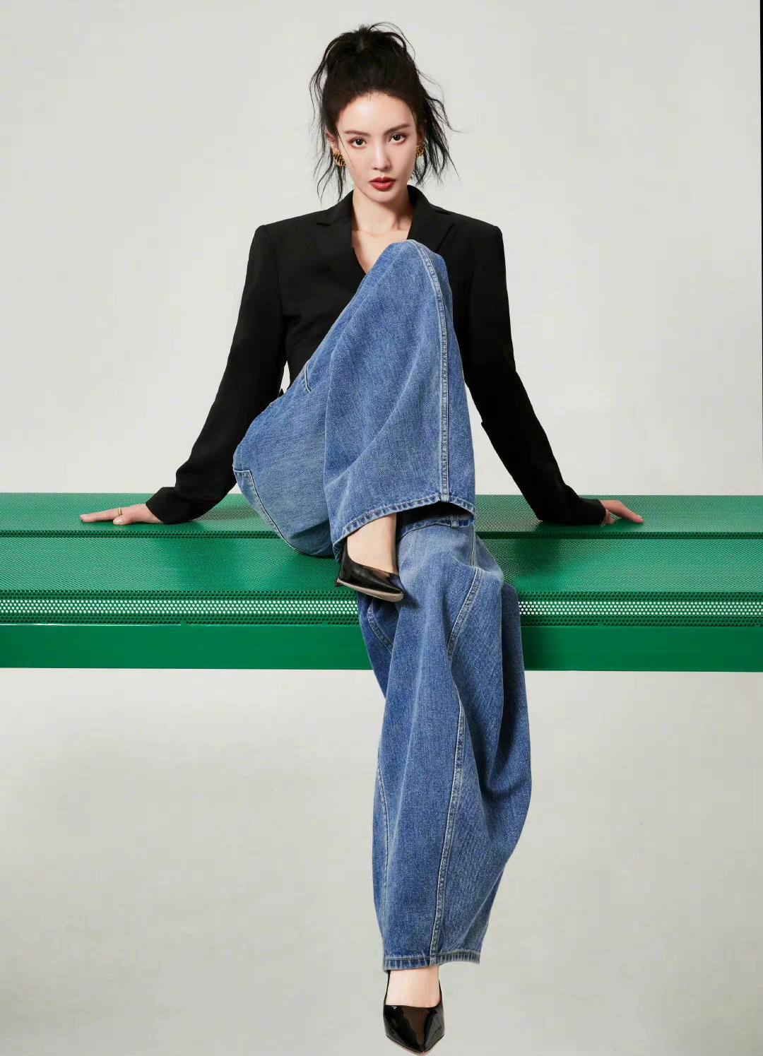 活动造型图集,扎起利落高马尾,黑色高腰西装搭配阔腿牛仔裤,简约时髦的穿搭,摩登女郎的自信风尚。