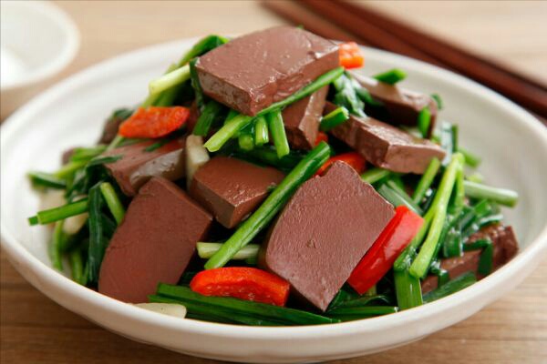 韭菜切段,鸭血切块,锅中烧开水,下入鸭血煮3分钟,捞出。锅内倒入适量的油,油热加上姜蒜煸香,然后来一勺豆瓣酱,炒匀后倒上鸭血翻炒,炒到断生后,加盐调味,然后放上韭菜炒到断生,出锅。