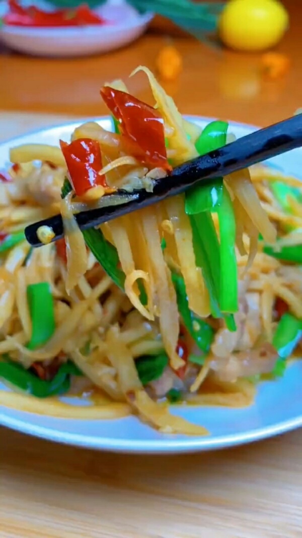 1、莲藕去皮清洗干净,再改刀切成丝,锅中烧油,油热放入牛肉丝,慢慢的煸炒出油脂,再放入蒜末、干辣椒炒出香味。