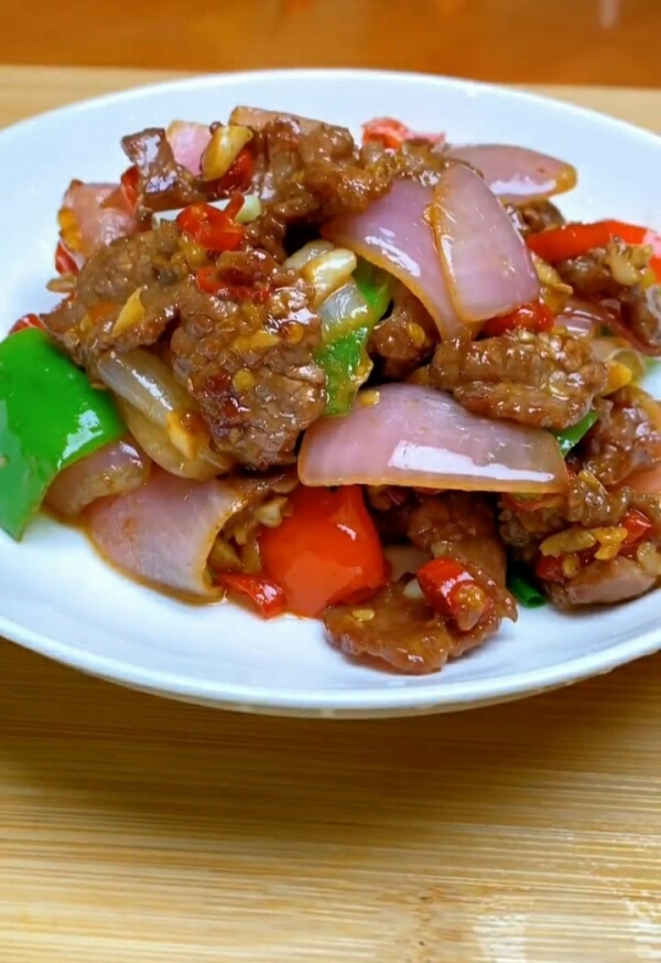 2、放入洋葱一起翻炒一分钟,再放青红椒,大火翻炒至断生即可。