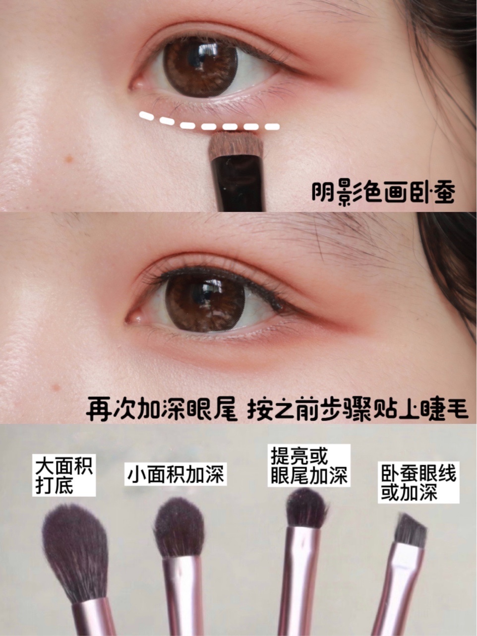 4⃣️浅色提亮卧蚕、烟头,再用小一点的刷子加深眼尾画眼线
