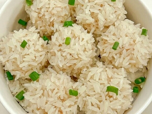 2、糯米清洗干净,提前浸泡一个晚上,然后捞起来沥干水分。将肉末揉成一个丸子,裹上一层糯米即可。