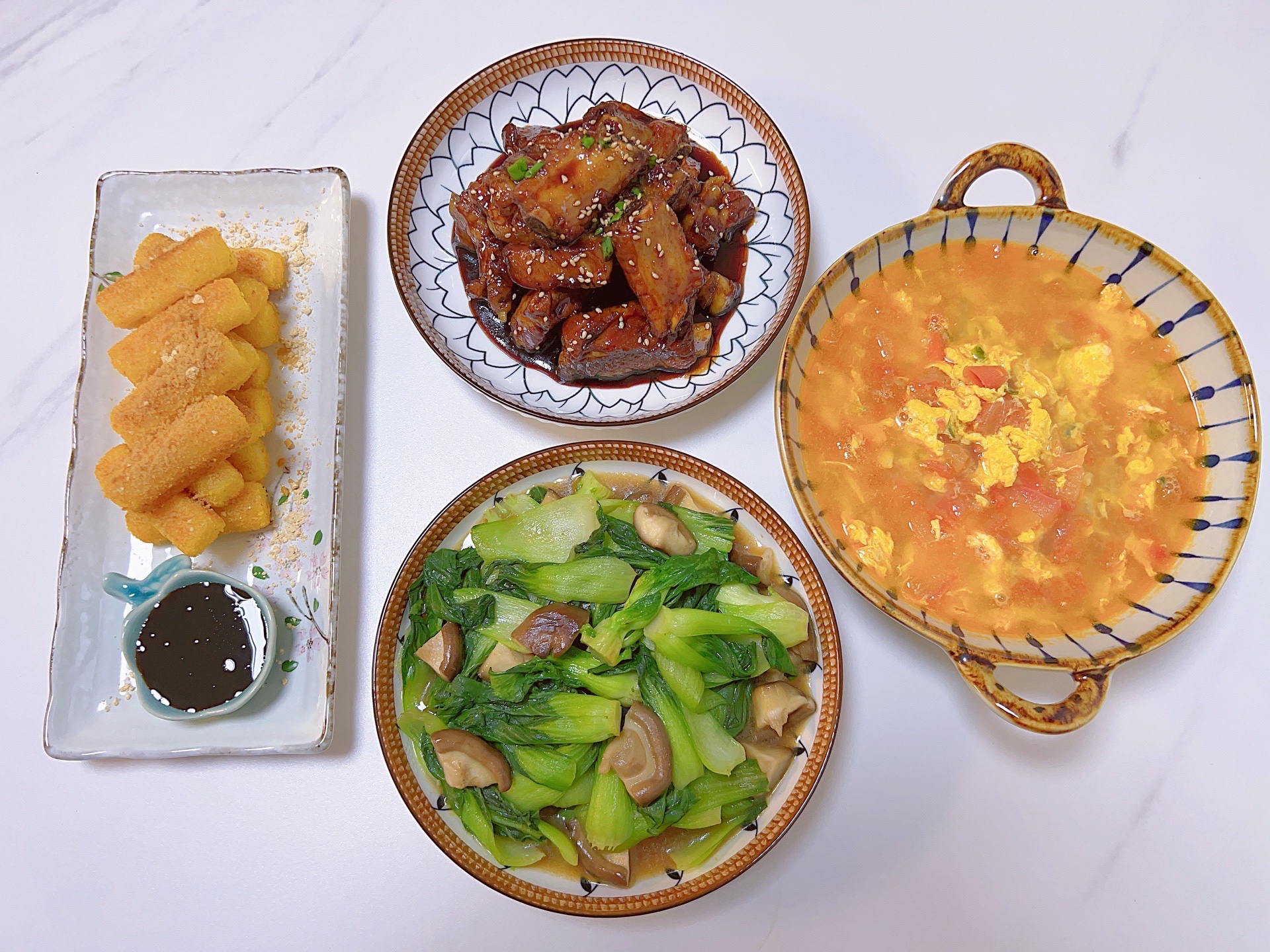 🍎红糖糍粑、香菇炒青菜、糖醋排骨、番茄蛋汤#家常菜抚人心
