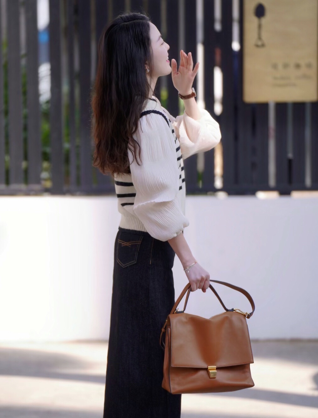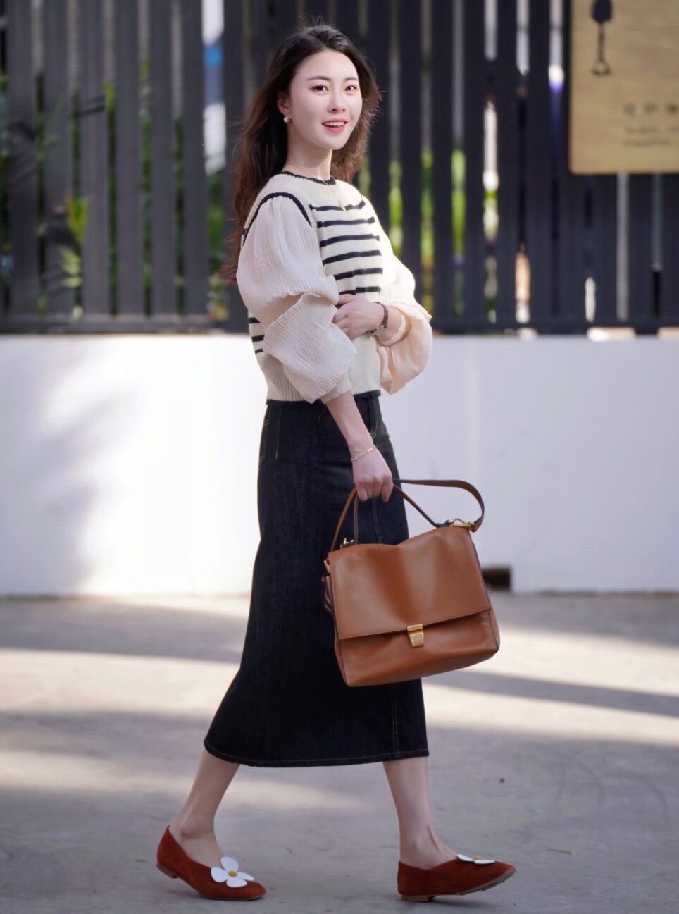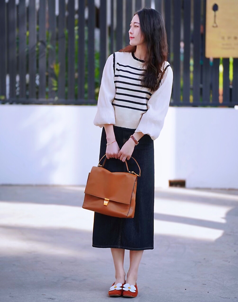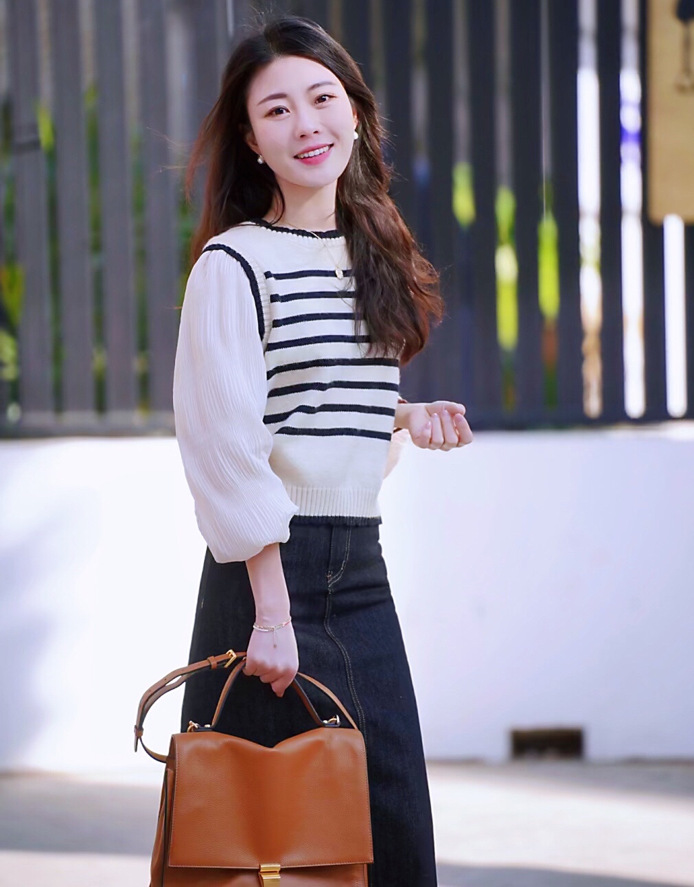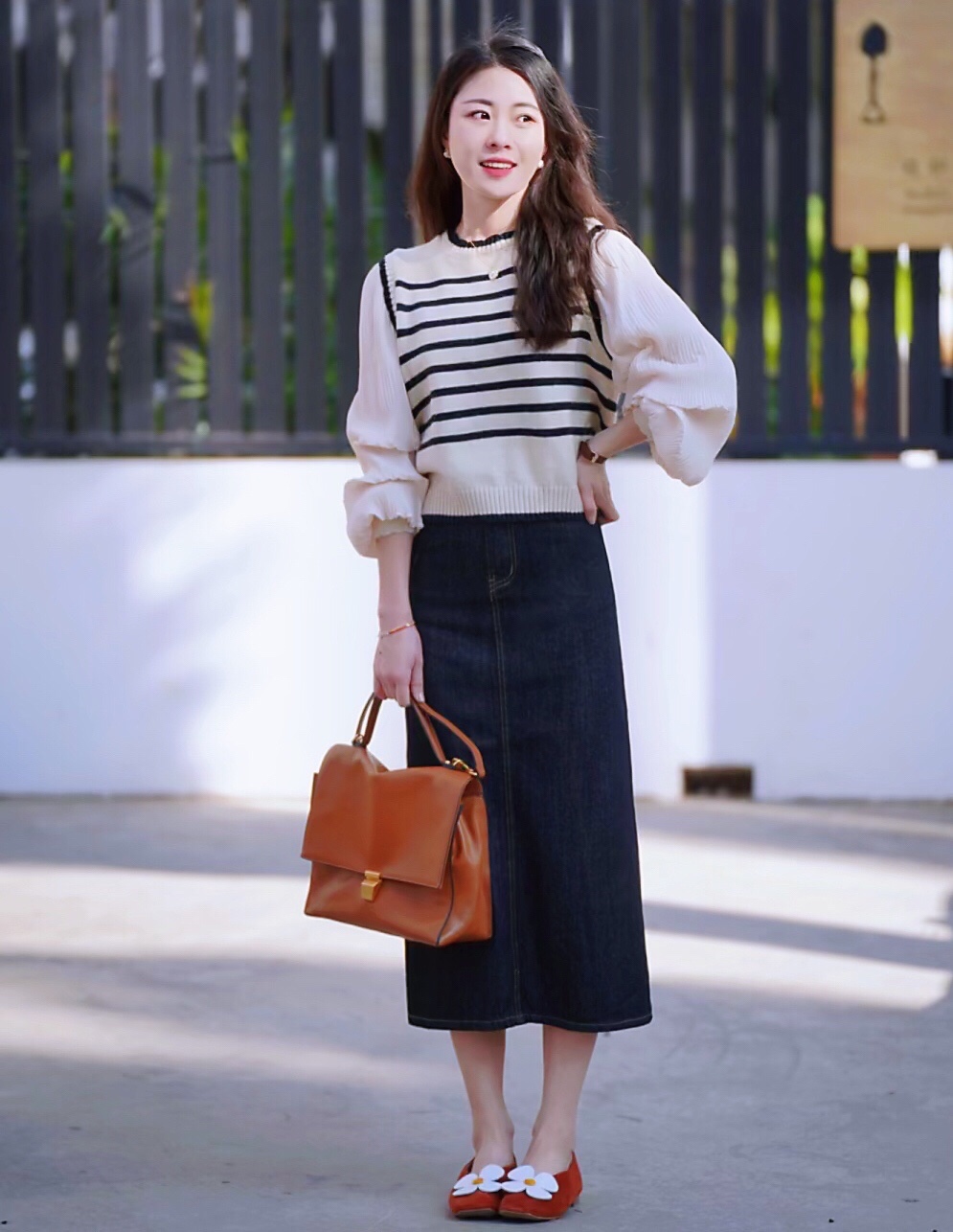 春季天气暖和,选择叠加的穿搭技巧,条纹的针织背心搭配上泡泡袖的衬衫和半身裙,温柔优雅又大方。