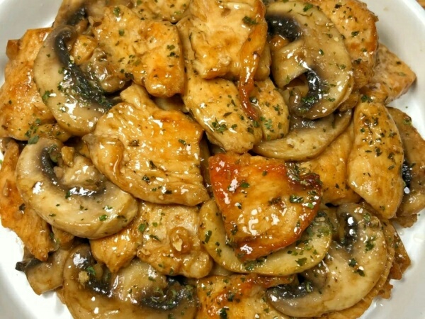 3.锅中留底油,继续加热后,放入蒜末爆香,接着倒入口蘑一起翻炒,炒软口蘑后,再倒入鸡胸肉,继续翻炒均匀。