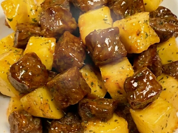 3.热锅烧油,油热以后,倒入腌制好牛肉翻炒油煎,炒至变色以后,再倒入菠萝继续翻炒。