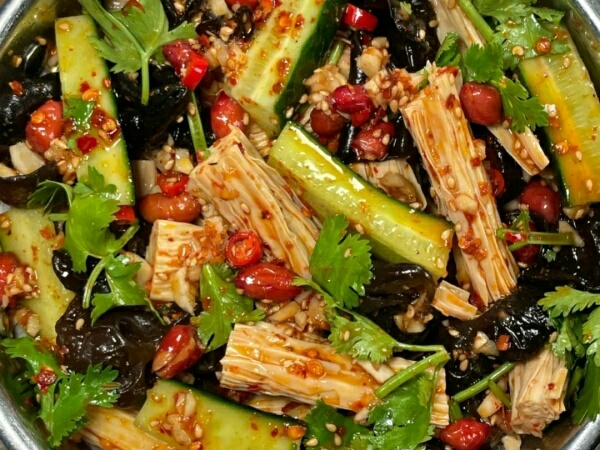 食材准备:腐竹、木耳、黄瓜、熟花生米、香菜、蒜末、小米辣、白芝麻、葱花。
