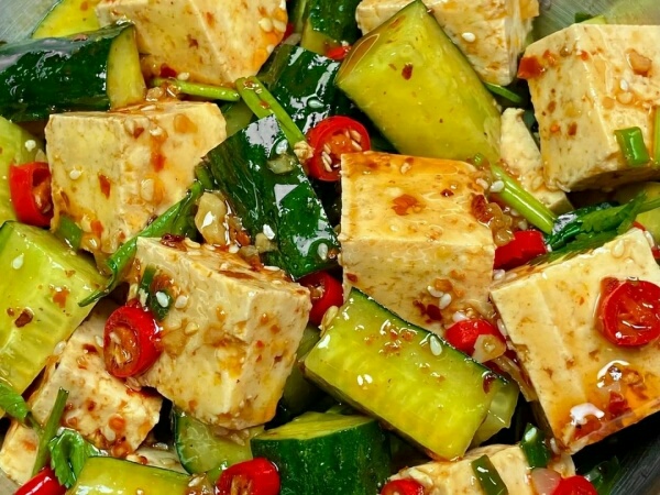 食材准备:豆腐、黄瓜、小米辣、蒜末、葱花、白芝麻、香菜。