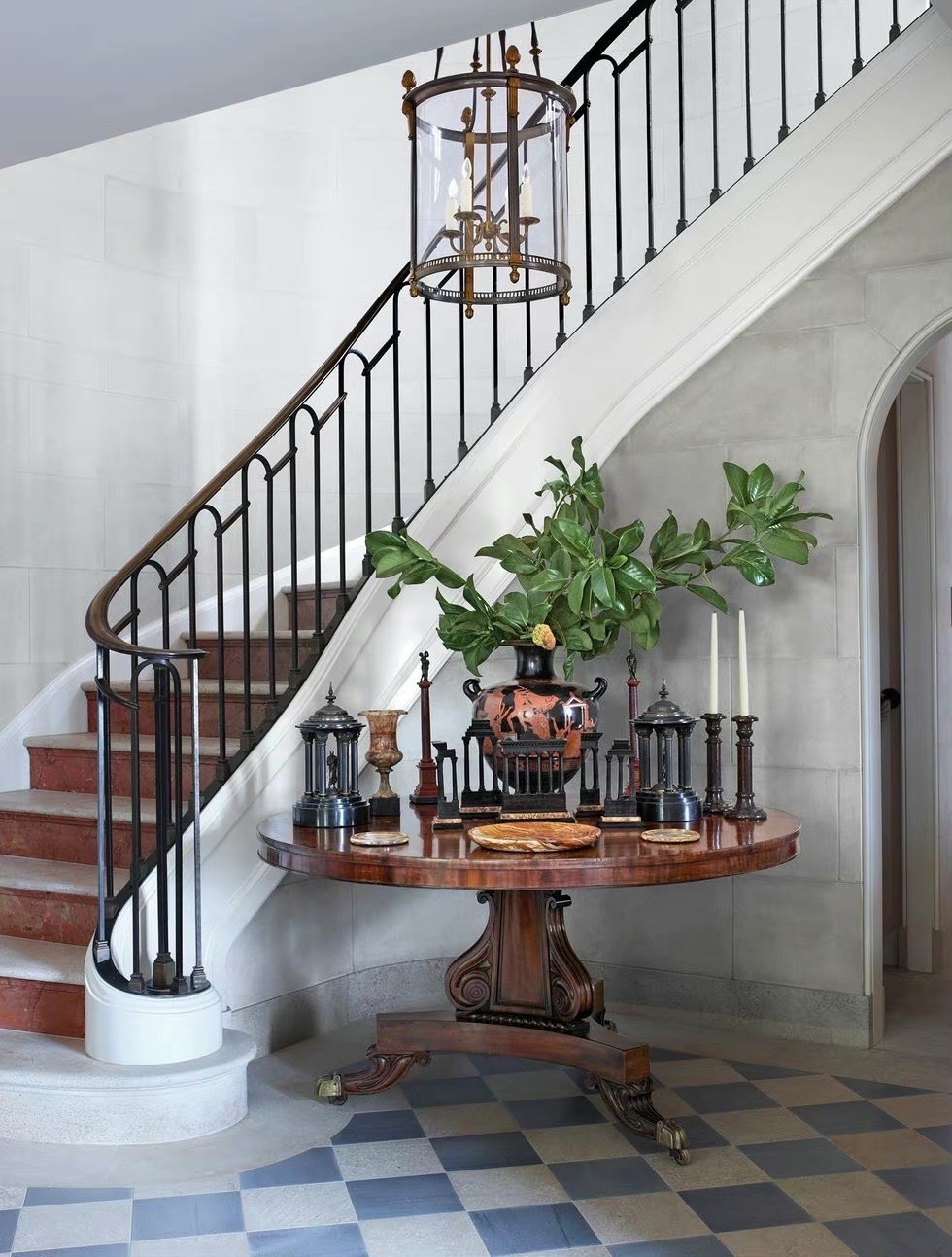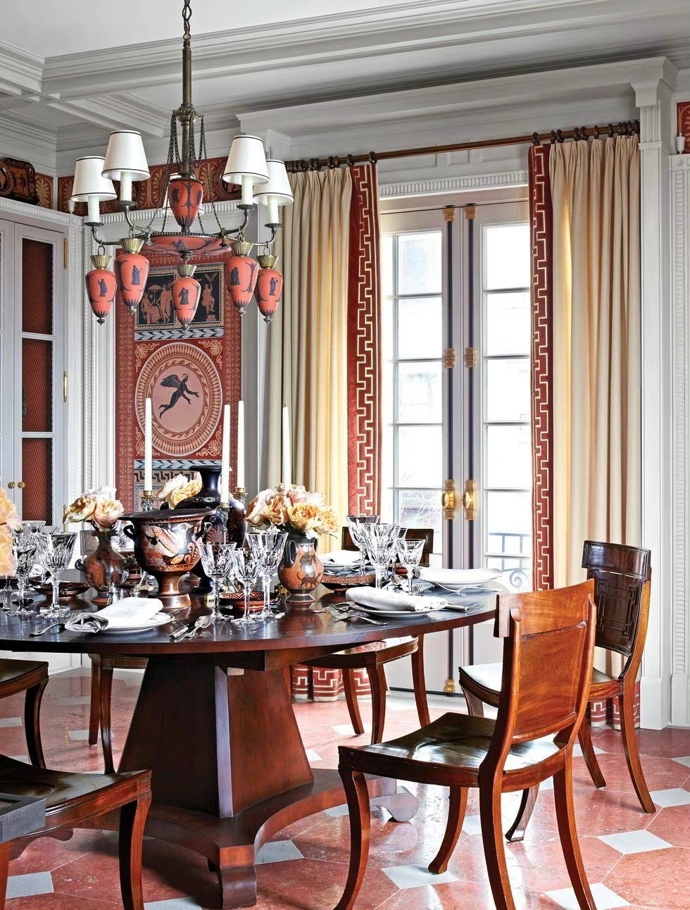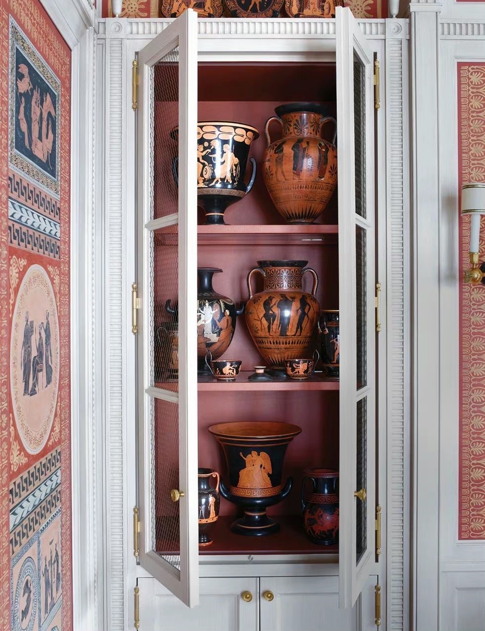 在意大利游览时是否想象过住在文艺复兴时期宫殿的生活 室内设计师 Alessandra Branca 在芝加哥一座1910年代的宅邸里实现了这个梦 一柜子的古希腊红陶罐 大理石古典艺术长廊 手绘的希腊风格墙面 1875的古董吊灯上点缀着 Wedgwood 的黑红浮雕瓷片 连浴室都铺满青金石的马赛克