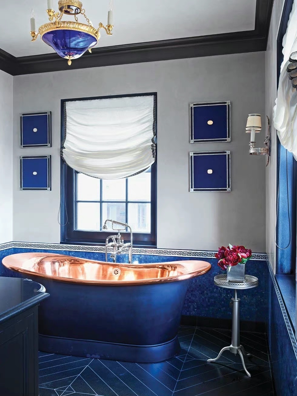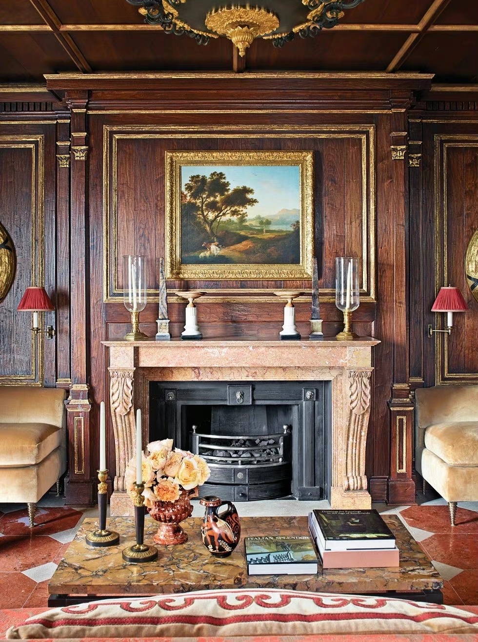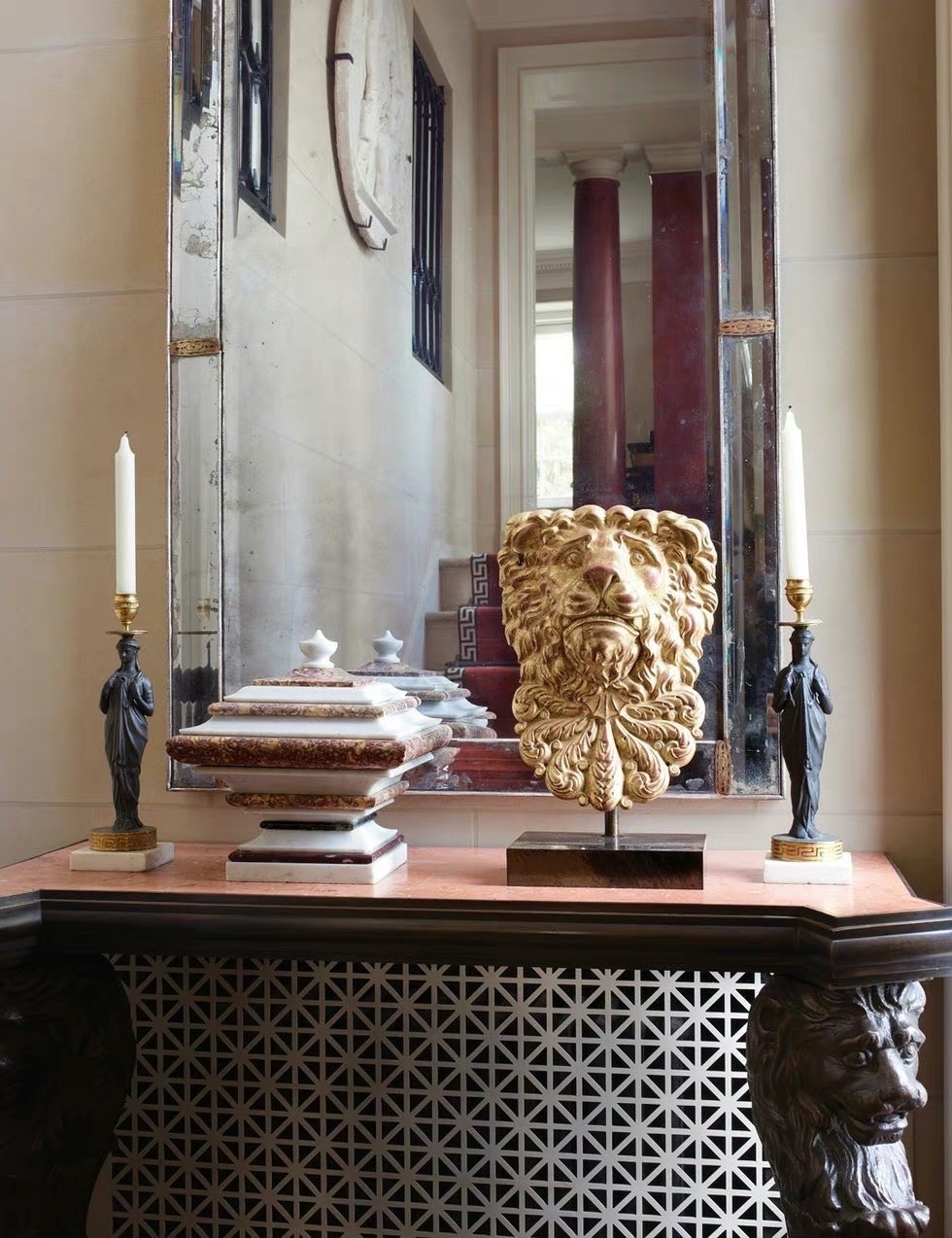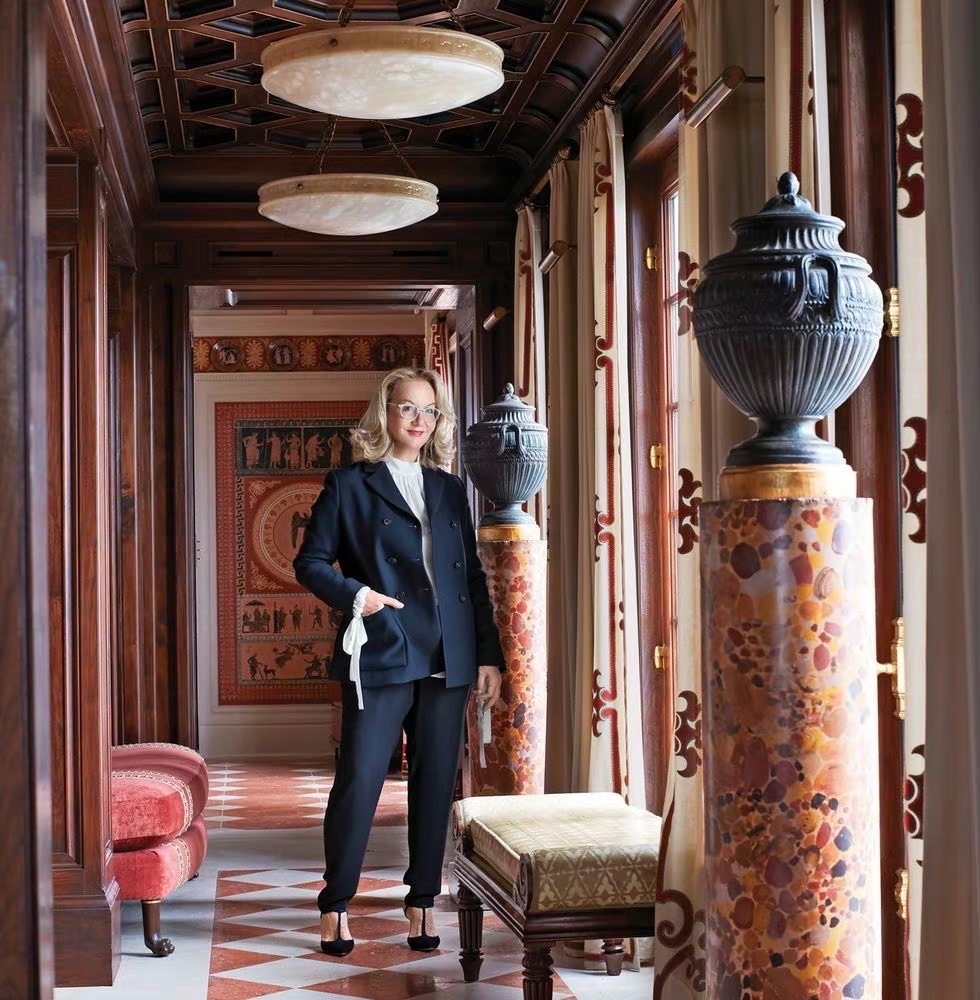 在意大利游览时是否想象过住在文艺复兴时期宫殿的生活 室内设计师 Alessandra Branca 在芝加哥一座1910年代的宅邸里实现了这个梦 一柜子的古希腊红陶罐 大理石古典艺术长廊 手绘的希腊风格墙面 1875的古董吊灯上点缀着 Wedgwood 的黑红浮雕瓷片 连浴室都铺满青金石的马赛克