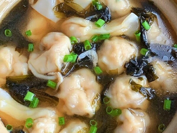 3、起锅烧水,水开后将馄饨放进去煮,煮至馄饨浮起来,就可以放入紫菜和虾皮,加入食盐、生抽调味,淋入一点香油。