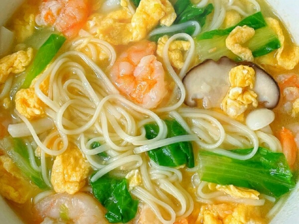 准备食材:面条,虾仁,鸡蛋,海鲜菇,香菇,青菜,葱花,蒜末。