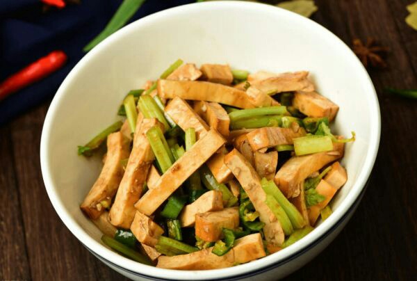 1、芹菜去掉叶子,摘洗干净,切成段,香干切成条备用。