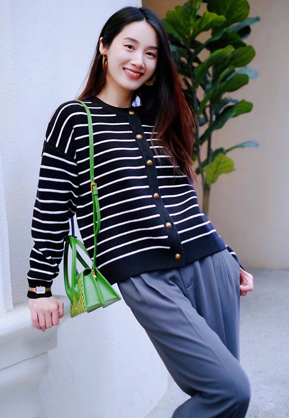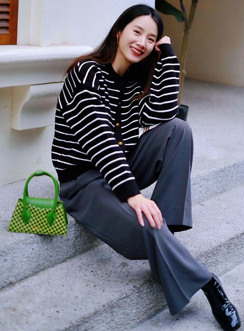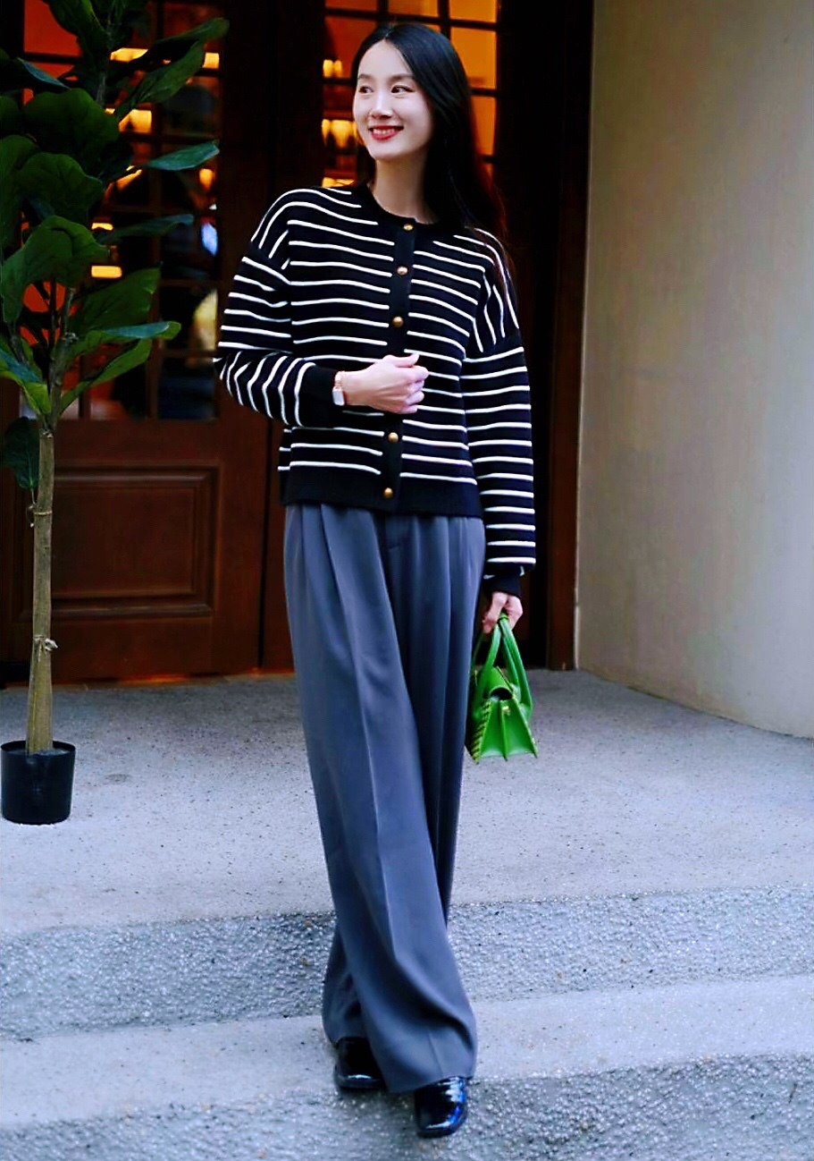 时尚元素的黑条纹针织开衫,搭配上休闲西裤,通勤时髦,简约又大气。