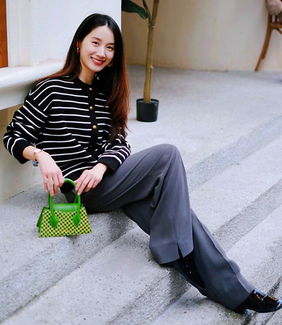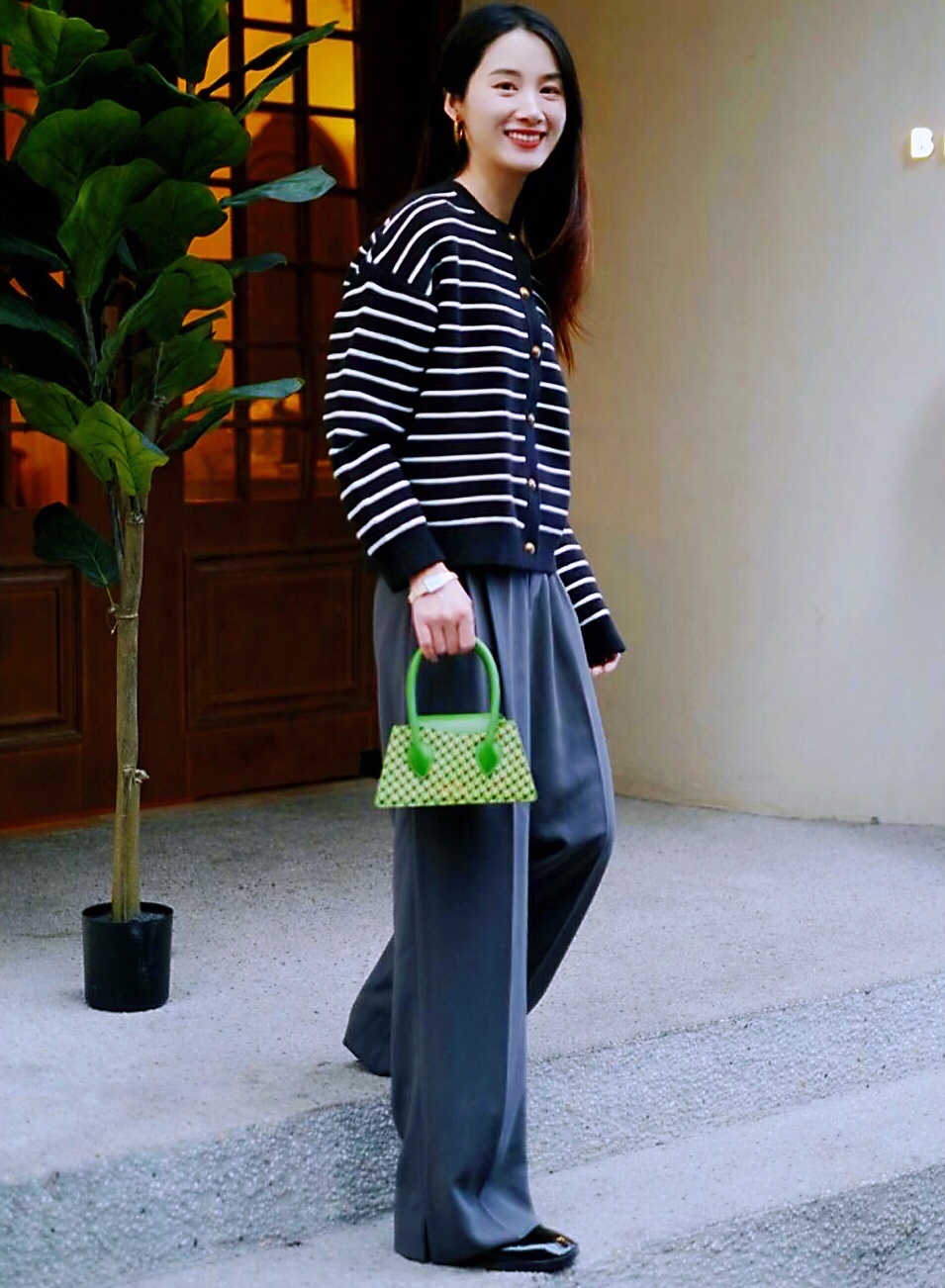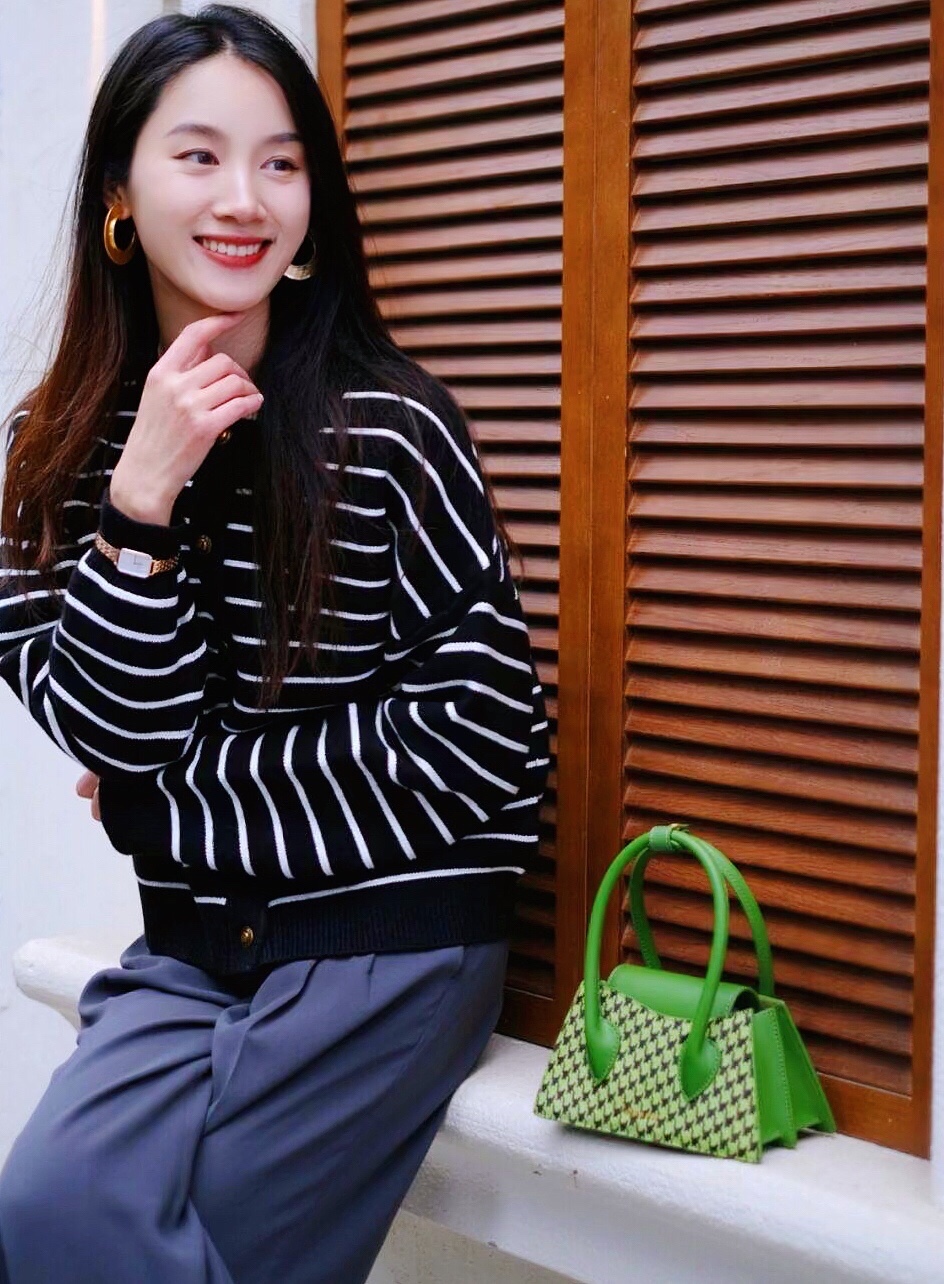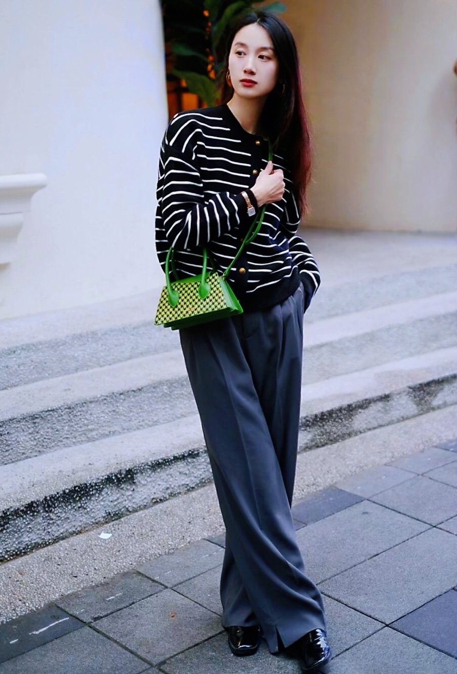 时尚元素的黑条纹针织开衫,搭配上休闲西裤,通勤时髦,简约又大气。
