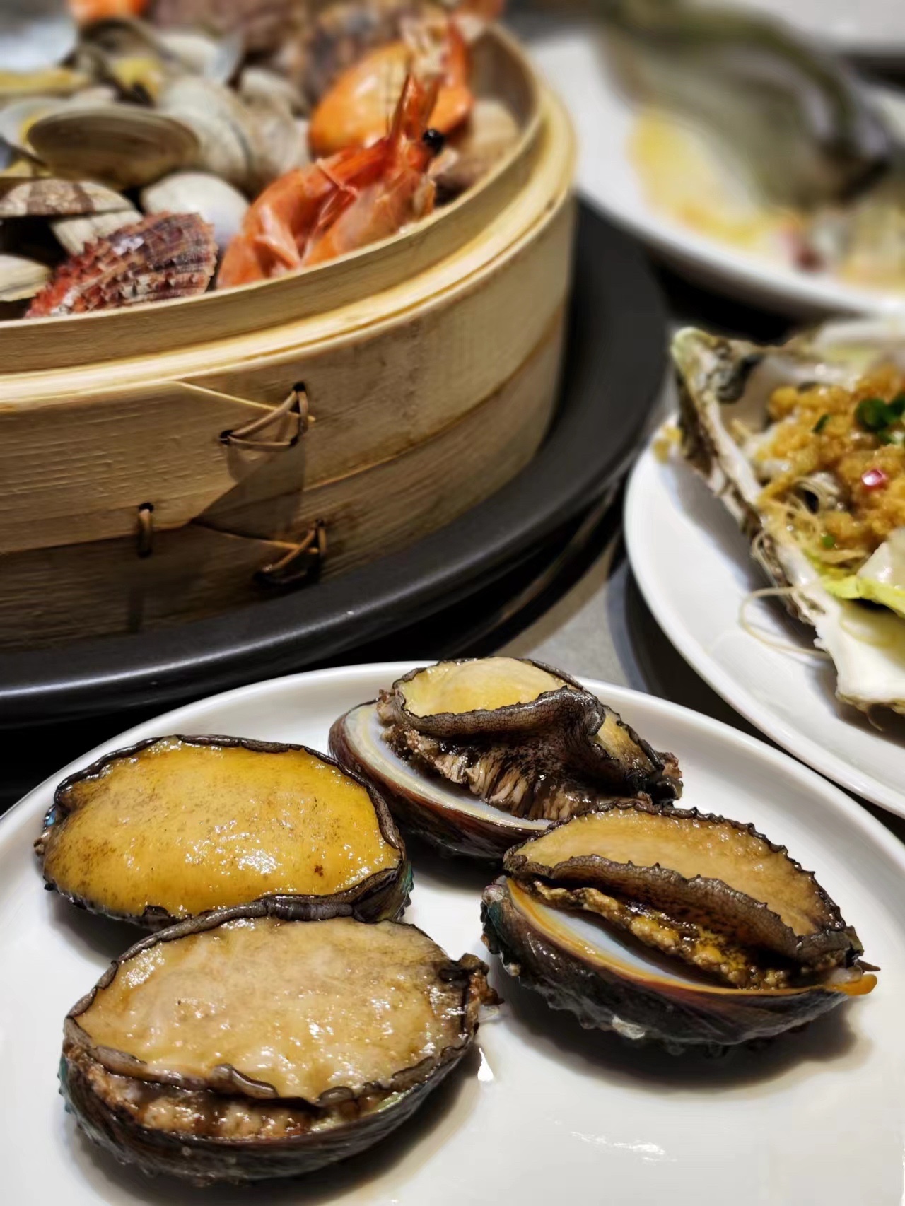 电梯🛗直达二层,映入眼帘的是超大的海鲜🦀️自选区和自助小料区。各色池子里全是鲜活虾类🦐、螃蟹、帝王蟹、生蚝🦪及各种贝类🐚、海胆、海参、鲍鱼等,让人眼花缭乱目不暇接❗️都是明码标价💰现点现捞,吃得就是一个鲜字❗️